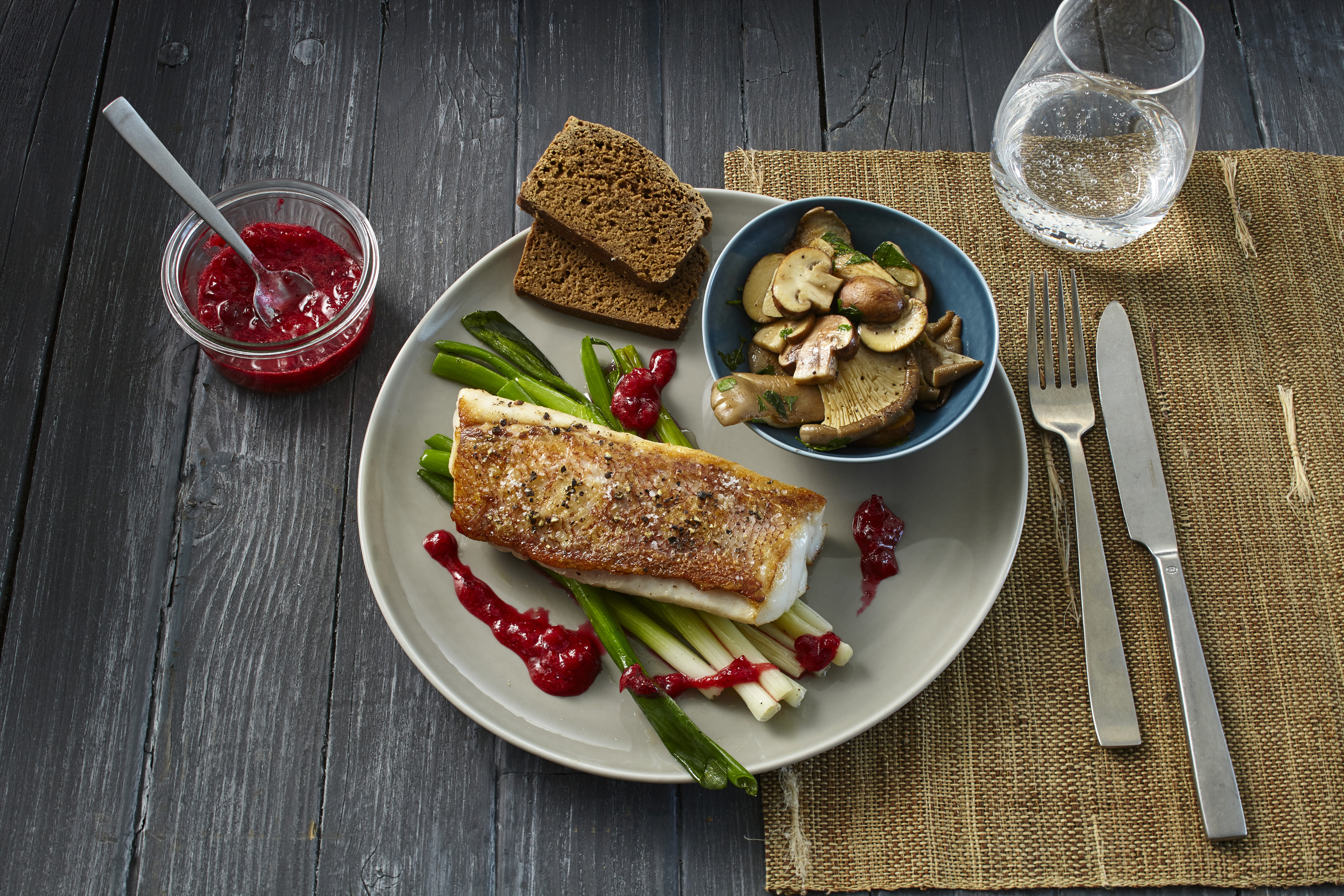 Hier macht es sich der isländische Rotbarsch mit seiner schönen Haut, einer fruchtigen Preiselbeermarmelade und würzigen Pilzen gemütlich.