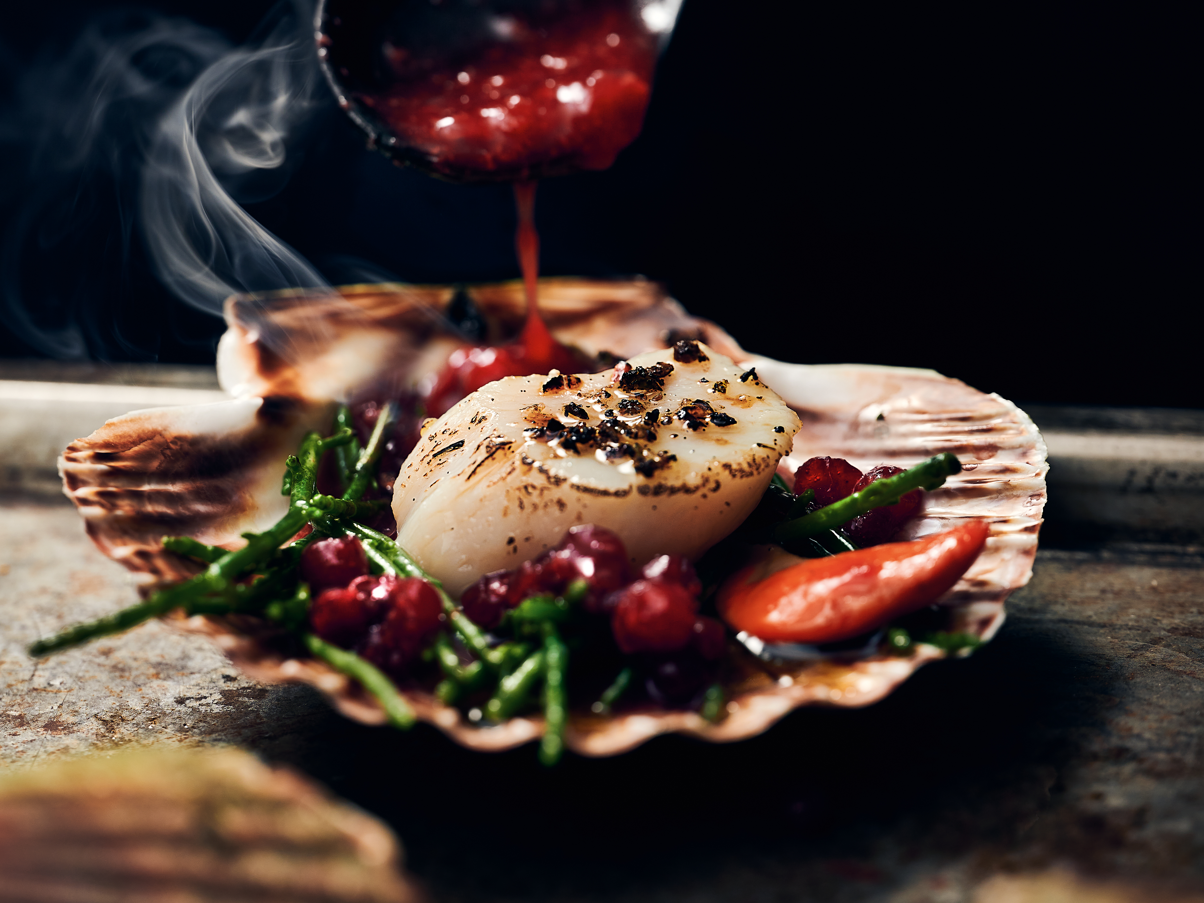 Nach der Garzeit Muscheln herausnehmen und den Muscheldeckel entfernen. Die Jakobsmuscheln mit dem Wacholder-Kaffee-Gewürz bestreuen und mit einem Crème Brûlée-Brenner kurz flambieren. Alles mit etwas Preiselbeer-Chutney beträufeln und servieren.