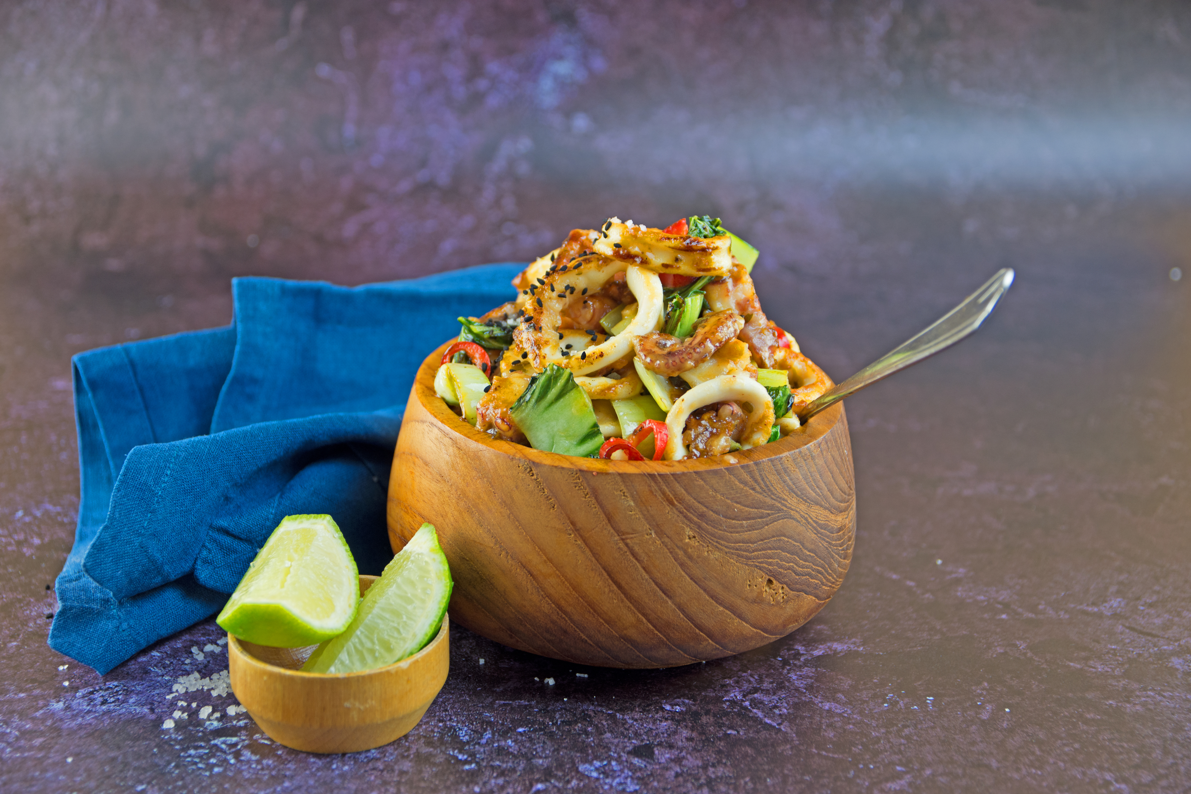 Dieser warme Tintenfischsalat geht schnell und braucht kaum Zutaten: Pulpo, Tintenfischringe, Pak Choi und Peperoni werden scharf in einem Wasabi-Dressing angebraten – fertig!