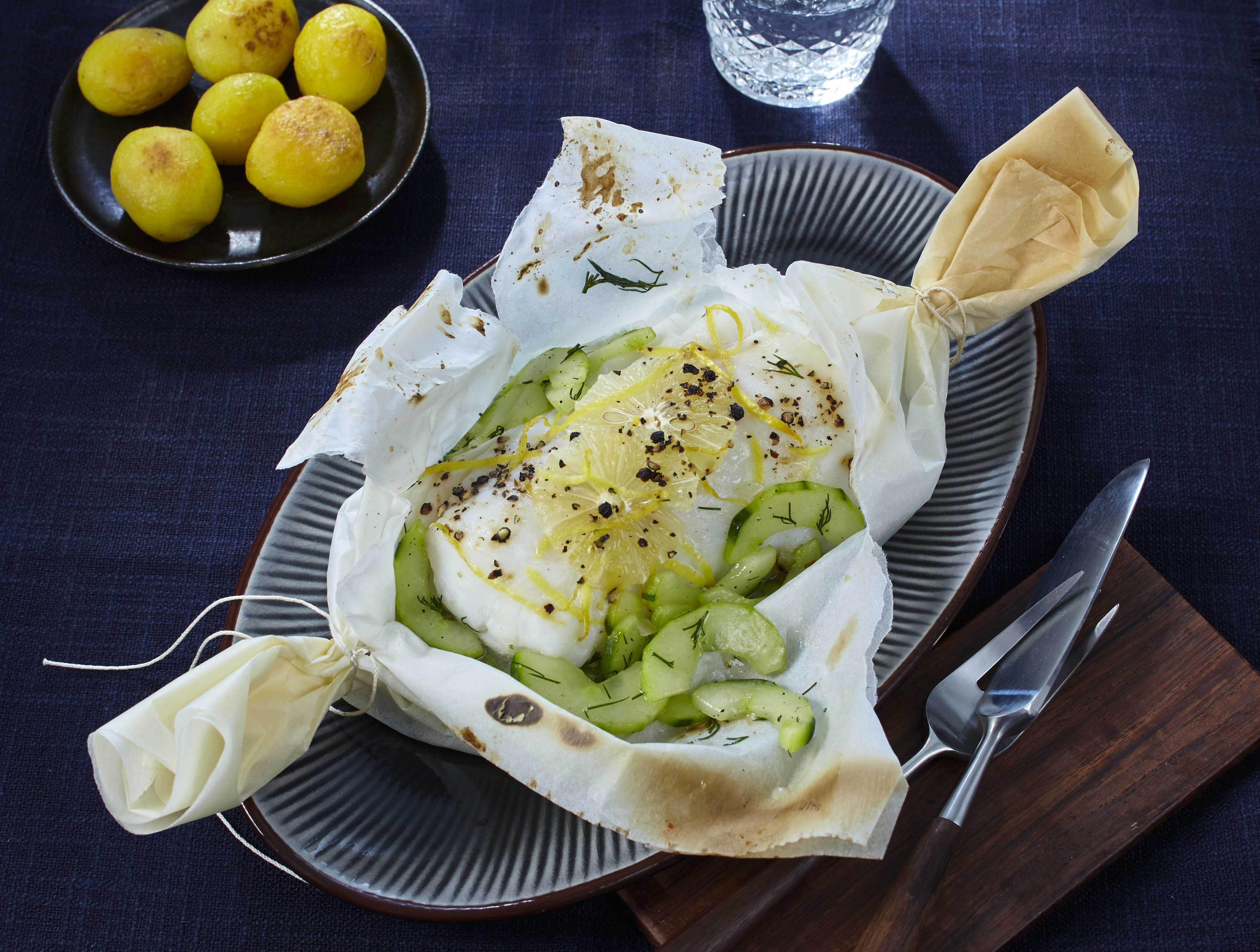 Zitronen heiß abwaschen, schälen und in Scheiben schneiden. Vier Bögen Pergament auf ca. 40 x 40 cm schneiden und jeweils in der Mitte leicht ölen. Erst die Gurken, dann den gewürzten Kabeljau und zum Schluss die Zitronenscheiben daraufsetzen. Pergament dicht verschließen und an den Enden mit Küchengarn zuknoten. Pakete auf ein Backblech setzen und im vorgeheizten Ofen bei 200°C für 15-18 Minuten garen. Dazu passen kleine Kartoffeln (Drillinge).