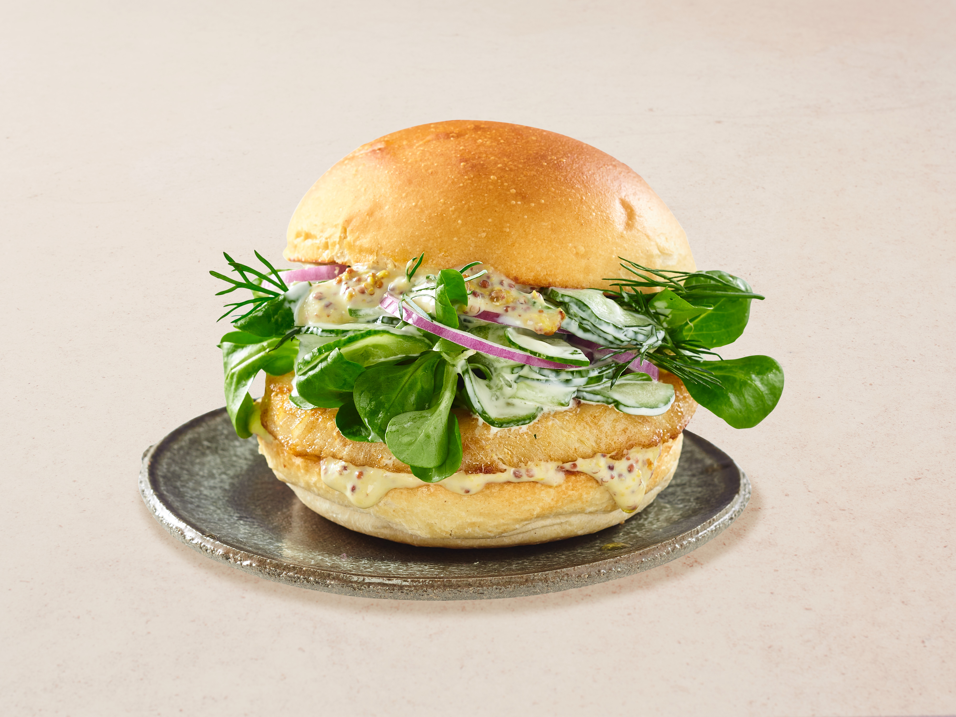 Hier kommt ein Geschmacks-Upgrade zum Backfischbrötchen und zwar mit saftigen Kabeljau-Patties, knackigem Gurkensalat und würziger Senfcreme.