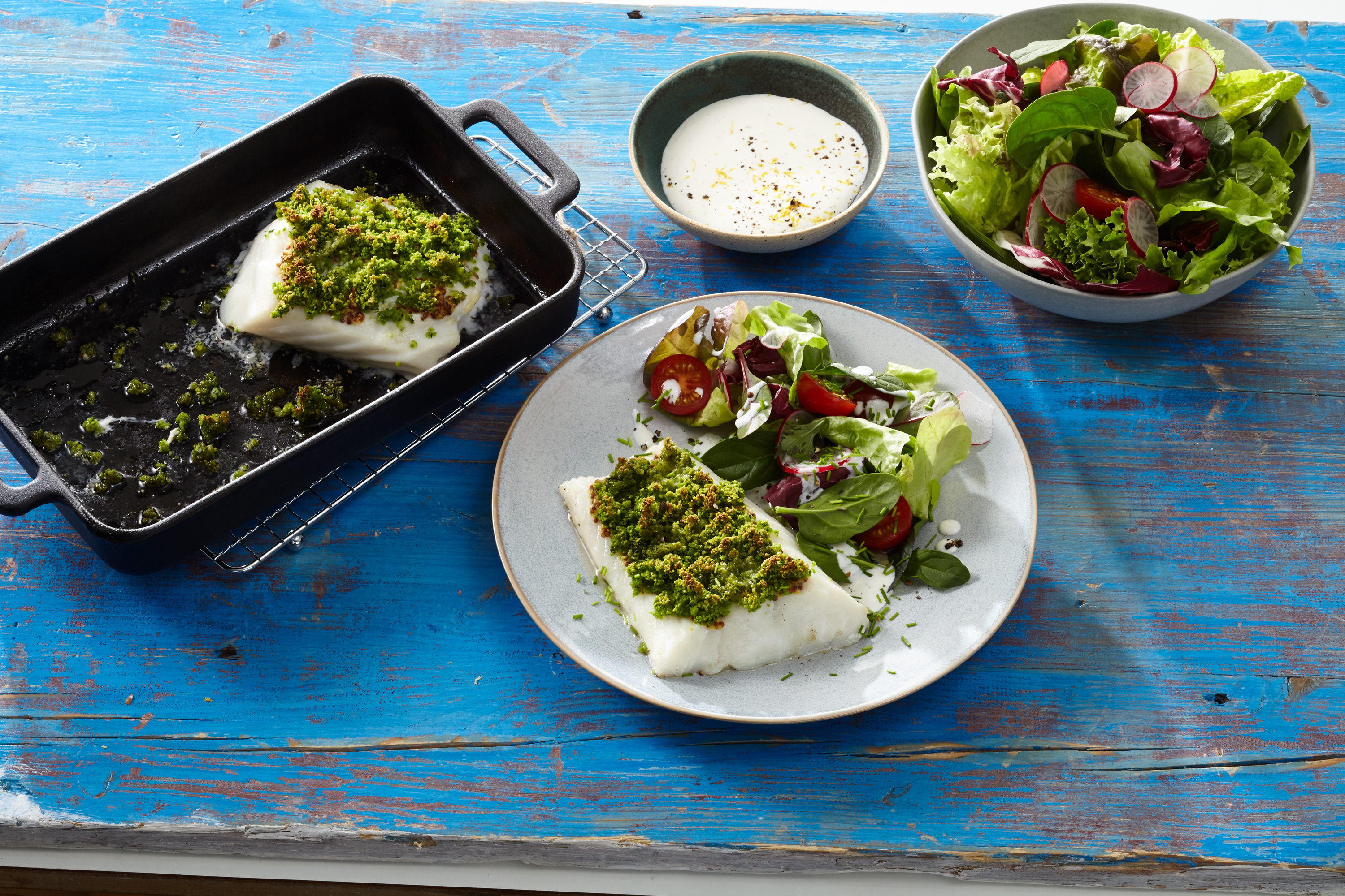 Schneller Kabeljau: Hier kommt ein köstliches Gericht in nur 20 Minuten auf den Teller: Kabeljau mit Kräuterkruste und frischem Salat.