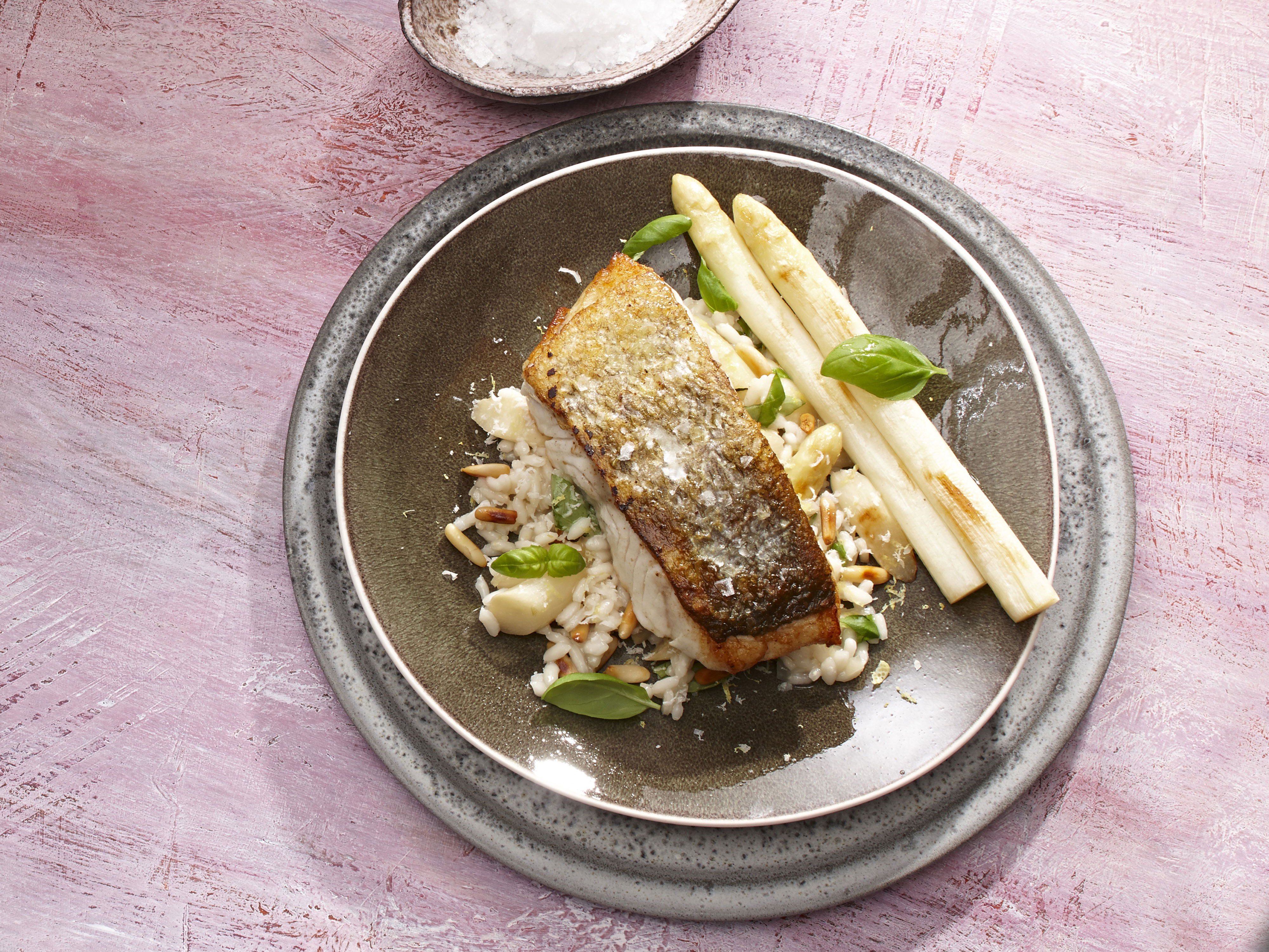 Spargel zusammen mit geriebenem Parmesan, Pinienkernen und Basilikum unter den Reis mischen. Risotto auf einem flachen Teller verteilen und den Kabeljau darauf anrichten. Mit der Butter aus der Pfanne beträufeln, leicht mit Fleur de Sel salzen und servieren.