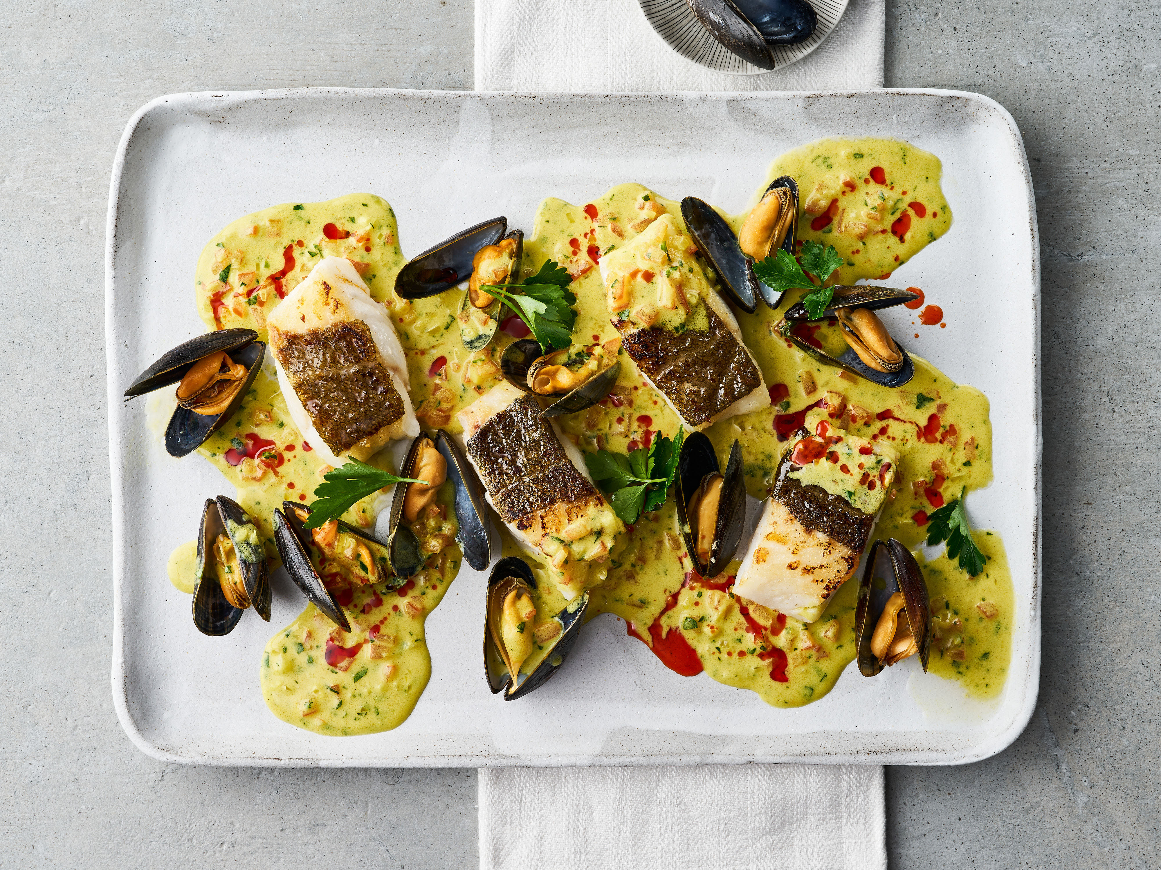 Die Currysauce ist auch perfekt geeignet, um sie als Sud zu Muscheln als Hauptgericht zu servieren. Dann Fisch weglassen und pro Portion 500 g Muscheln mit Schale garen. Die Sauce passt übrigens auch zu Venusmuscheln oder Neuseeländischen Grünschalmuscheln.