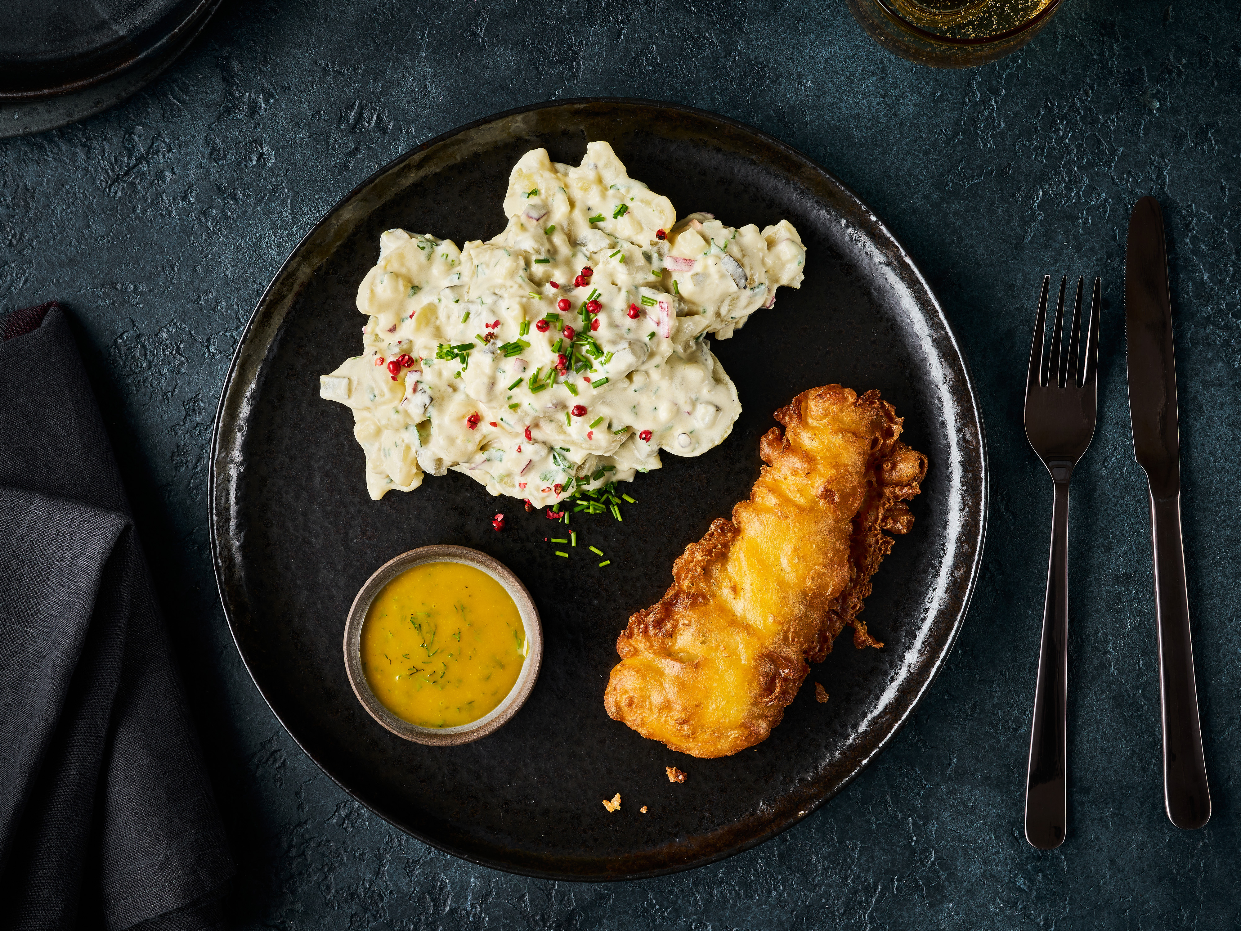 Zum Kartoffelsalat passen neben Wiener Würstchen auch Backfisch, Goldlocke, geräucherte Forelle, Stremellachs oder einfach Räucherlachsscheiben die mit einer Honig-Dill-Senf-Sauce serviert werden können.