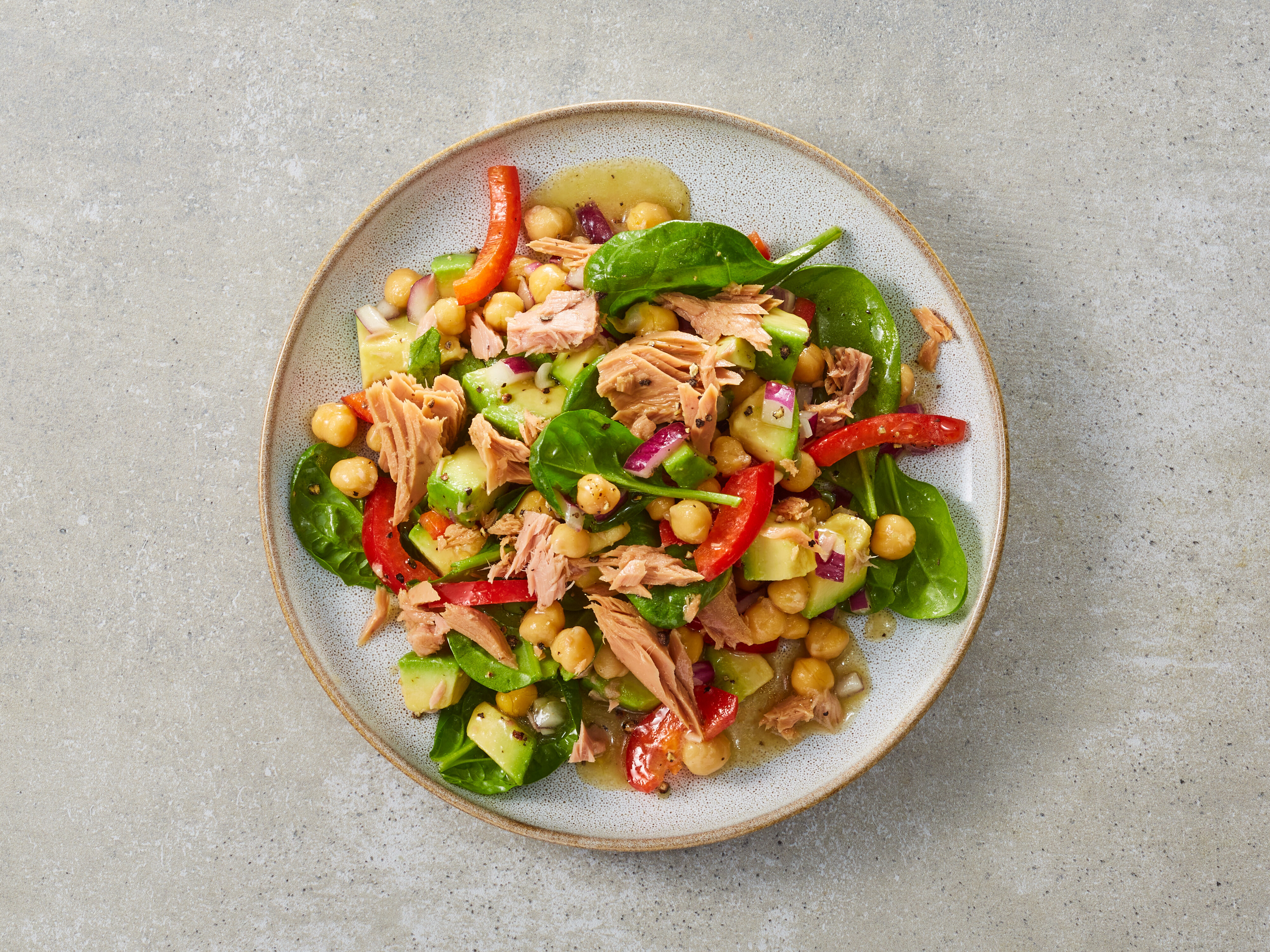 - 3 Thunfisch abgießen und zusammen mit Zwiebeln, Paprika, Avocado und Kichererbsen in eine Schüssel geben, mit dem Dressing vermengen und mit Salz und Pfeffer abschmecken.