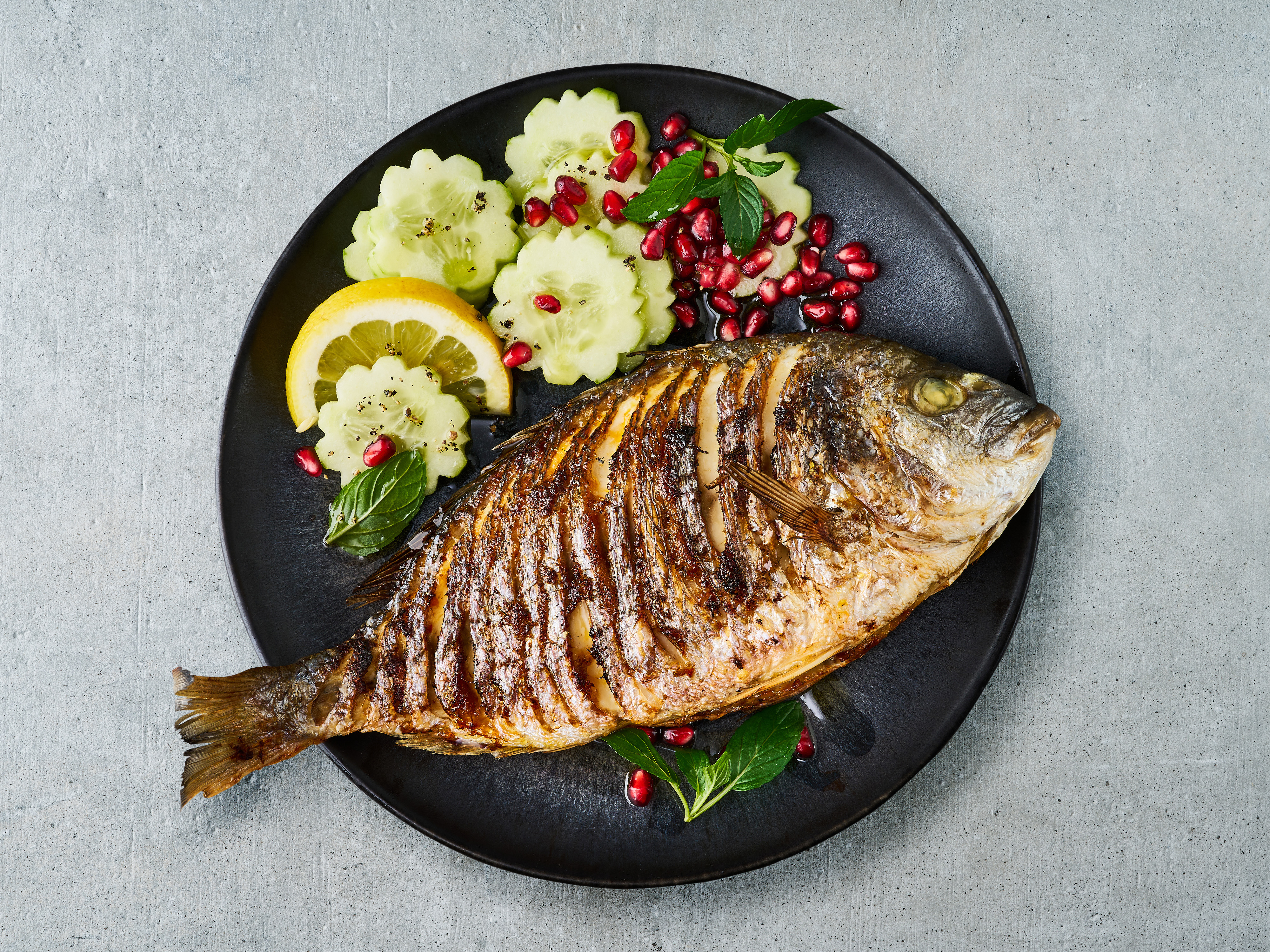 - 4 Doraden auf Tellern anrichten und Gurken, Granatapfelkerne und Minze darum verteilen. Alles mit Olivenöl beträufeln und mit Salz und Pfeffer würzen. Mit Zitronenspalten garnieren.