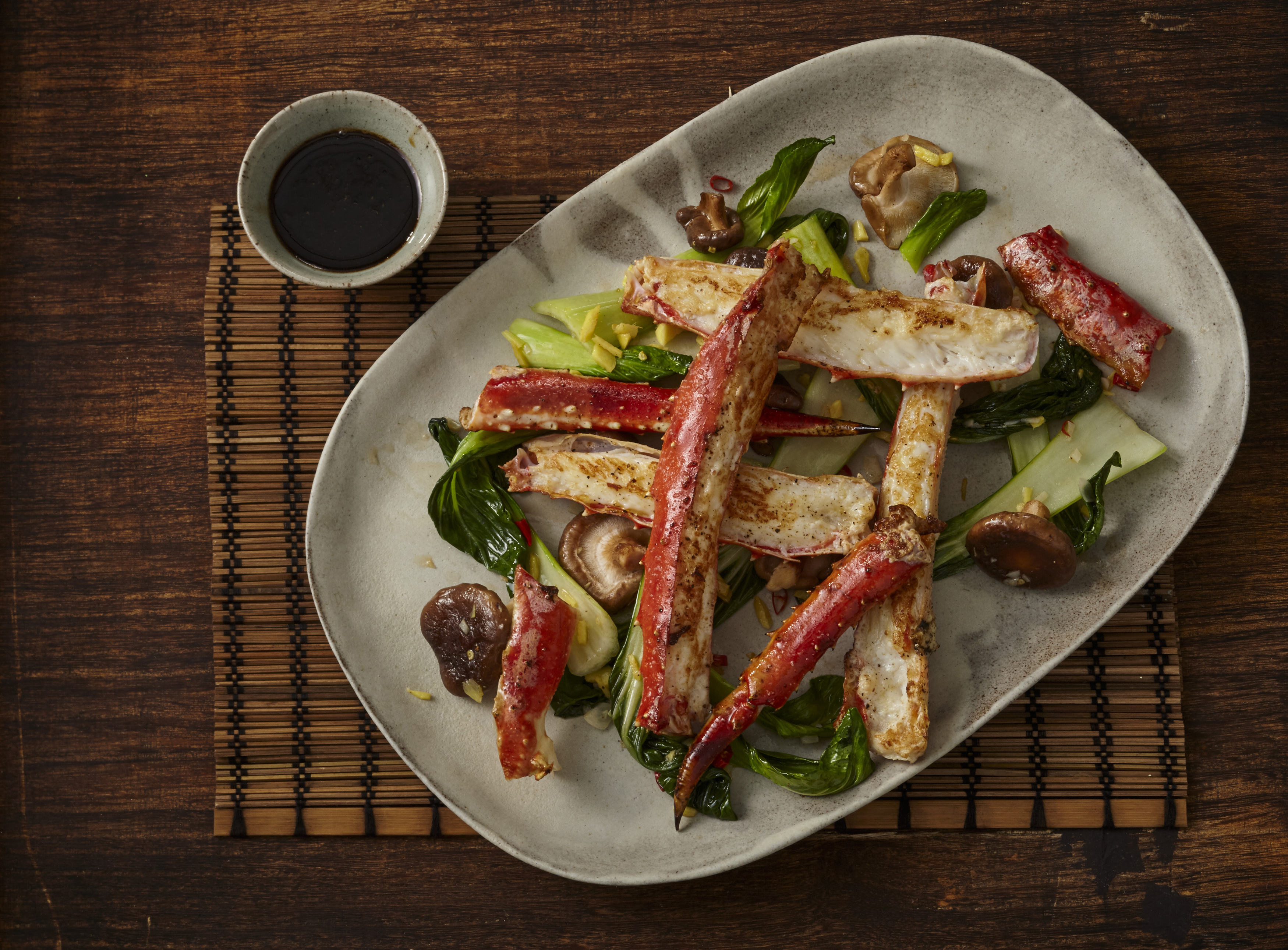 Jetzt wird’s asiatisch: In der Schale gebratene Königskrabbenbeine mit Ponzusauce, Shiitakepilzen und Pak Choi.