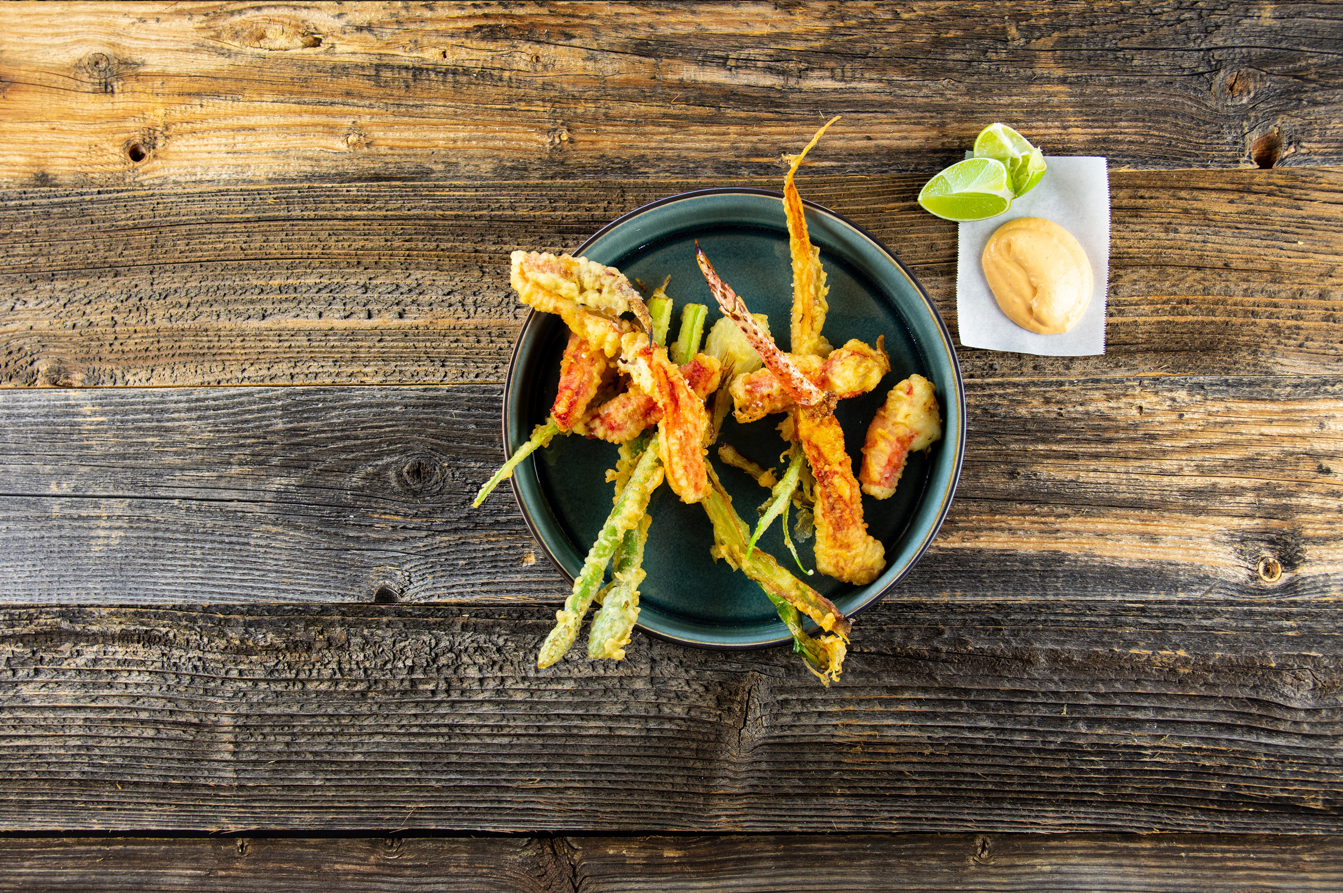 Soulfood auf Japanisch: Würzig-nussiges Fleisch der Königskrabbe & knackig grüner Spargel in frittiertem Tempurateig und dazu eine feurige Aioli.