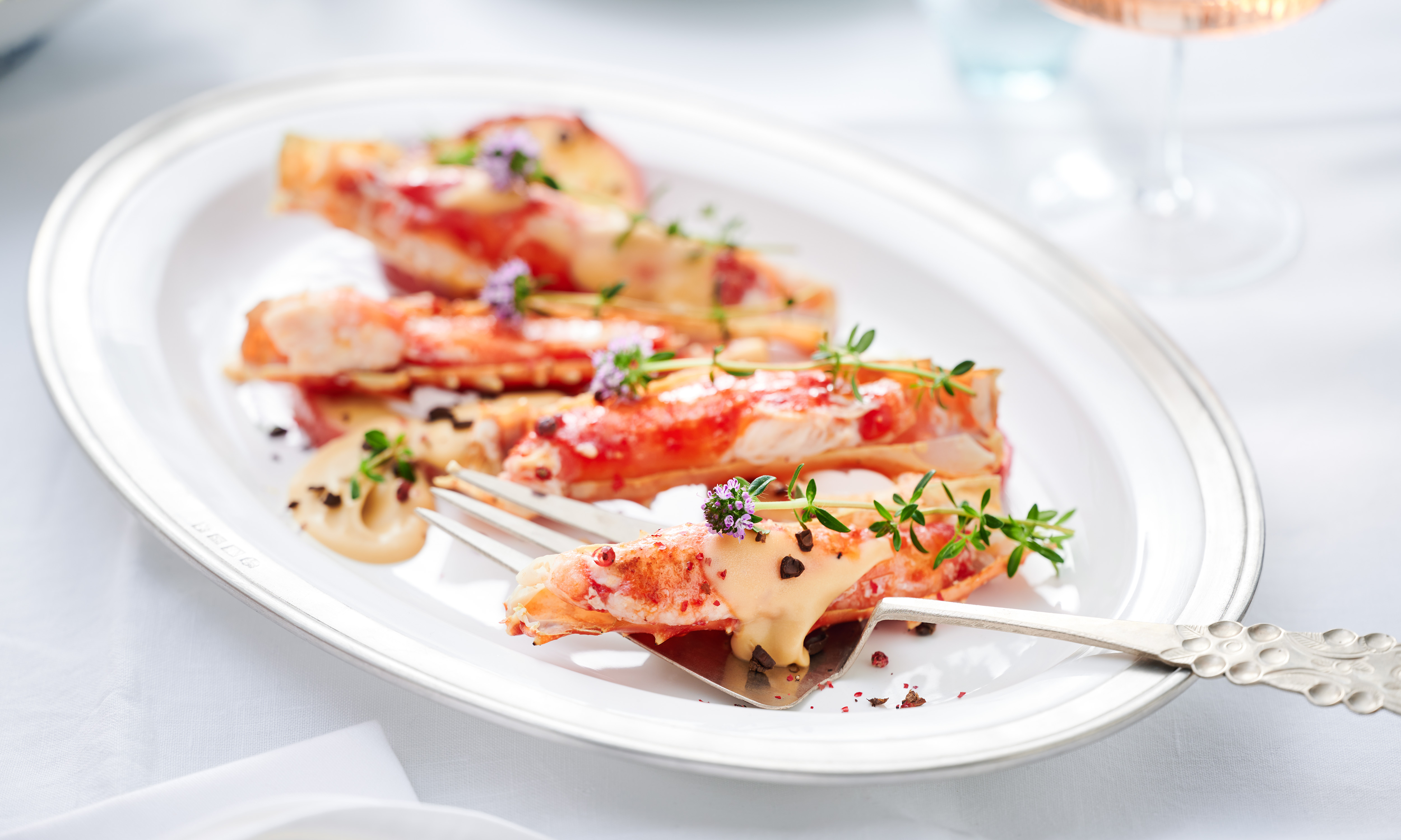 Königskrabbenbeine auftauen lassen. Beine in den Gelenken durchschlagen und mit einer Schere aufschneiden, um das Fleisch aus den Schalen zu lösen. Schalen abspülen und abtropfen lassen. Die Schalen ca. 2 Minuten in kochendes Wasser geben, sodass sie sich rot einfärben. Die Schalen zum Anrichten beiseite legen.