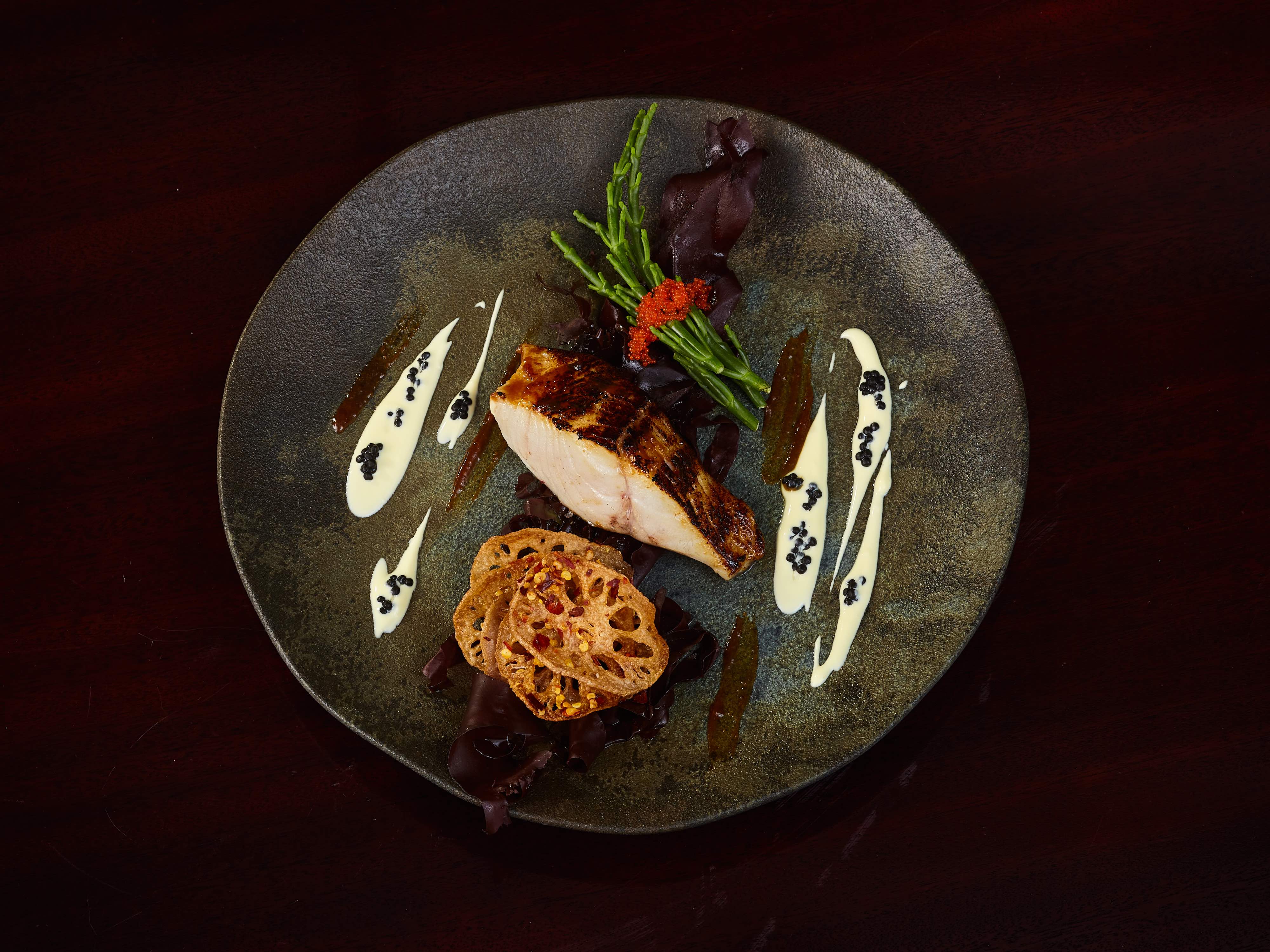 Wunderbare Kombinationsmöglichkeit - mit frittierten Lotuswurzeln, Salicornes und frischen Meeresalgen. Dazu eine feine Sauce mit Misoaroma.