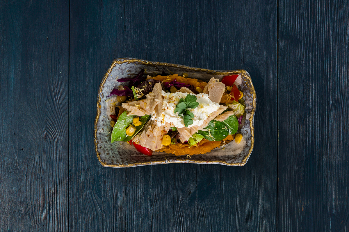 Soulfood aus der Türkei: Schnelle Süßkartoffel aus der Mikrowelle gefüllt mit Thunfisch, Kichererbsen, Rotkrautsalat und Spitzpaprika, getoppt mit Zitronenquark.