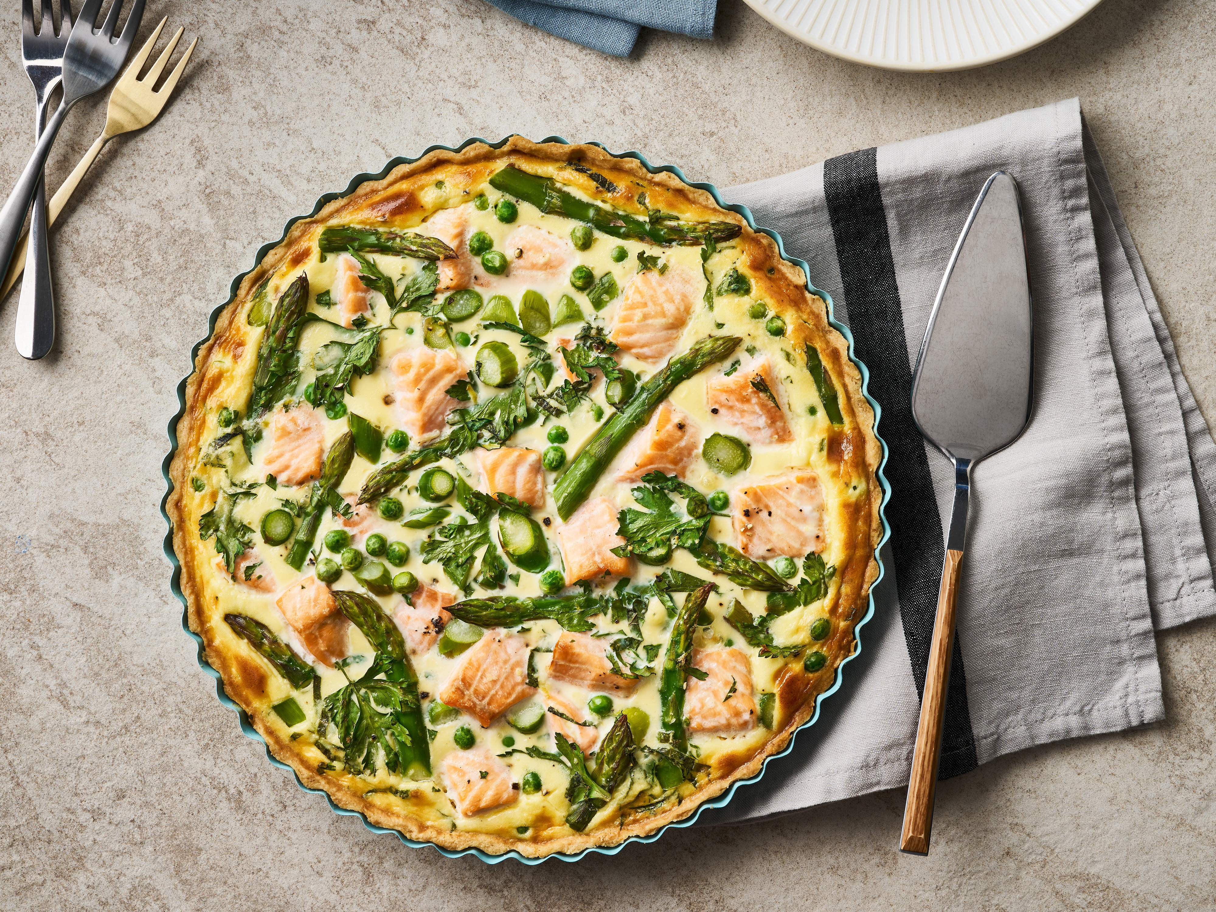 - 7 Fisch mit Salz und Pfeffer würzen und mit Erbsen, Spargel und den Kräutern in den Quicheboden geben. Alles mit der Sahnemischung übergießen und ca. 35 Minuten auf der mittleren Schiene im Ofen backen. Quiche nach dem Backen einige Minuten ruhen lassen, dann servieren und aufschneiden.