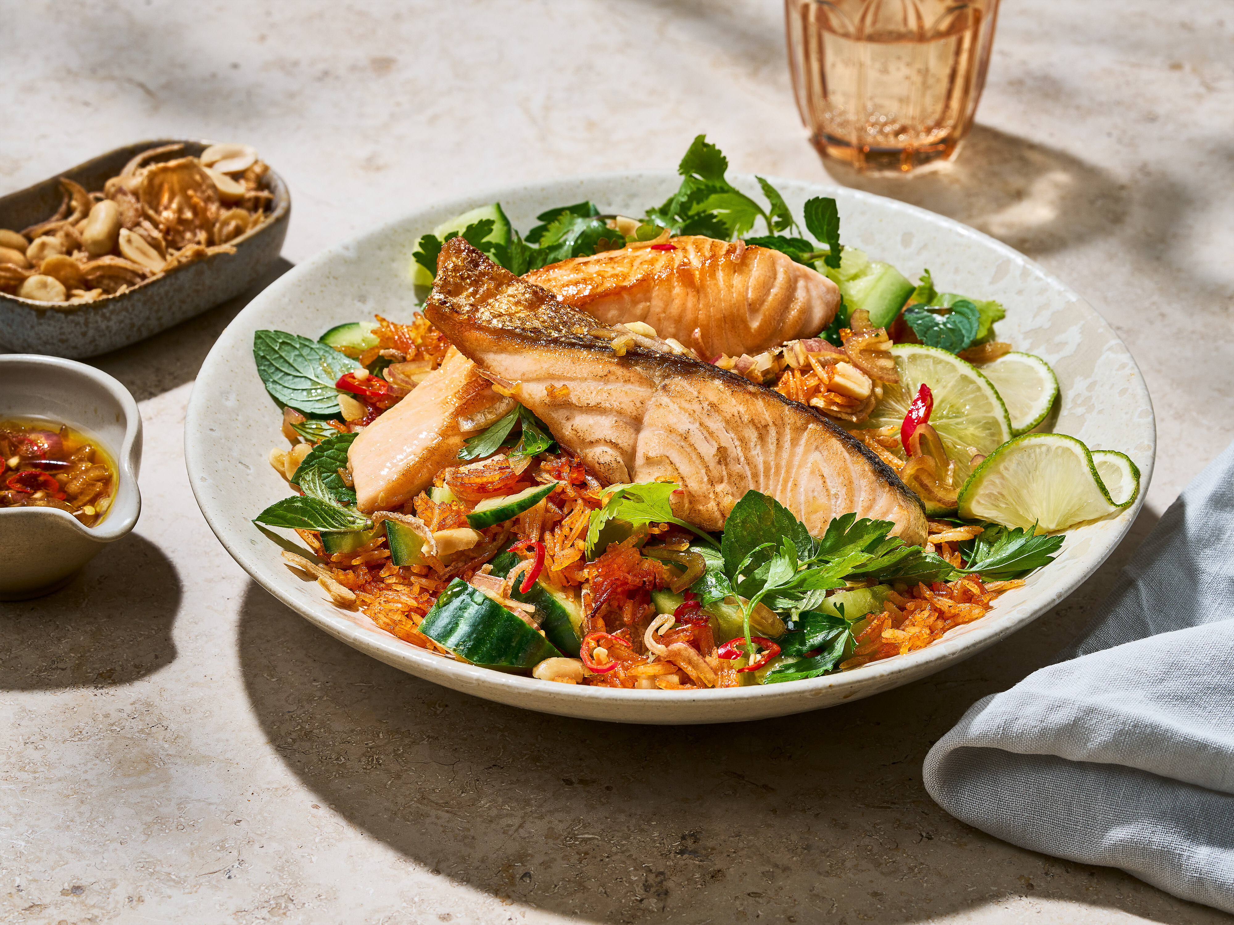 Chili-Fans aufgepasst! Für diesen Salat marinieren wir gekochten Reis mit der scharfen koreanischen Gewürzpaste Gochujang, backen ihn danach knusprig und runden mit Kräutern, Gurke und einem asiatischen Dressing ab. Dazu: saftige gebratene Lachsfilets.
