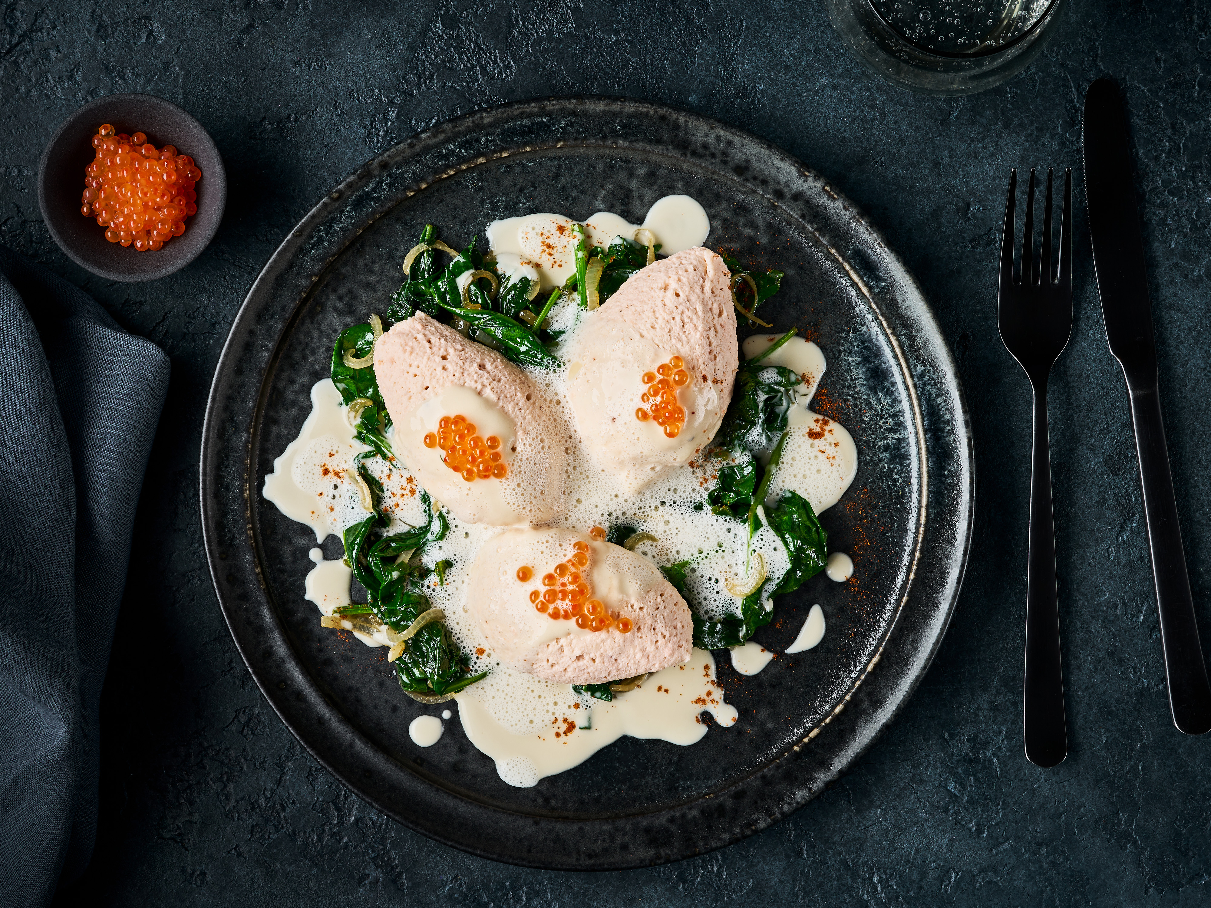 - 6 Spinat auf vier Tellern verteilen. Nocken aus dem Wasser nehmen, etwas abtropfen und auf dem Spinat anrichten. Sauce noch einmal erhitzen, aufschäumen und über die Nocken träufeln. Kaviar darüber verteilen.