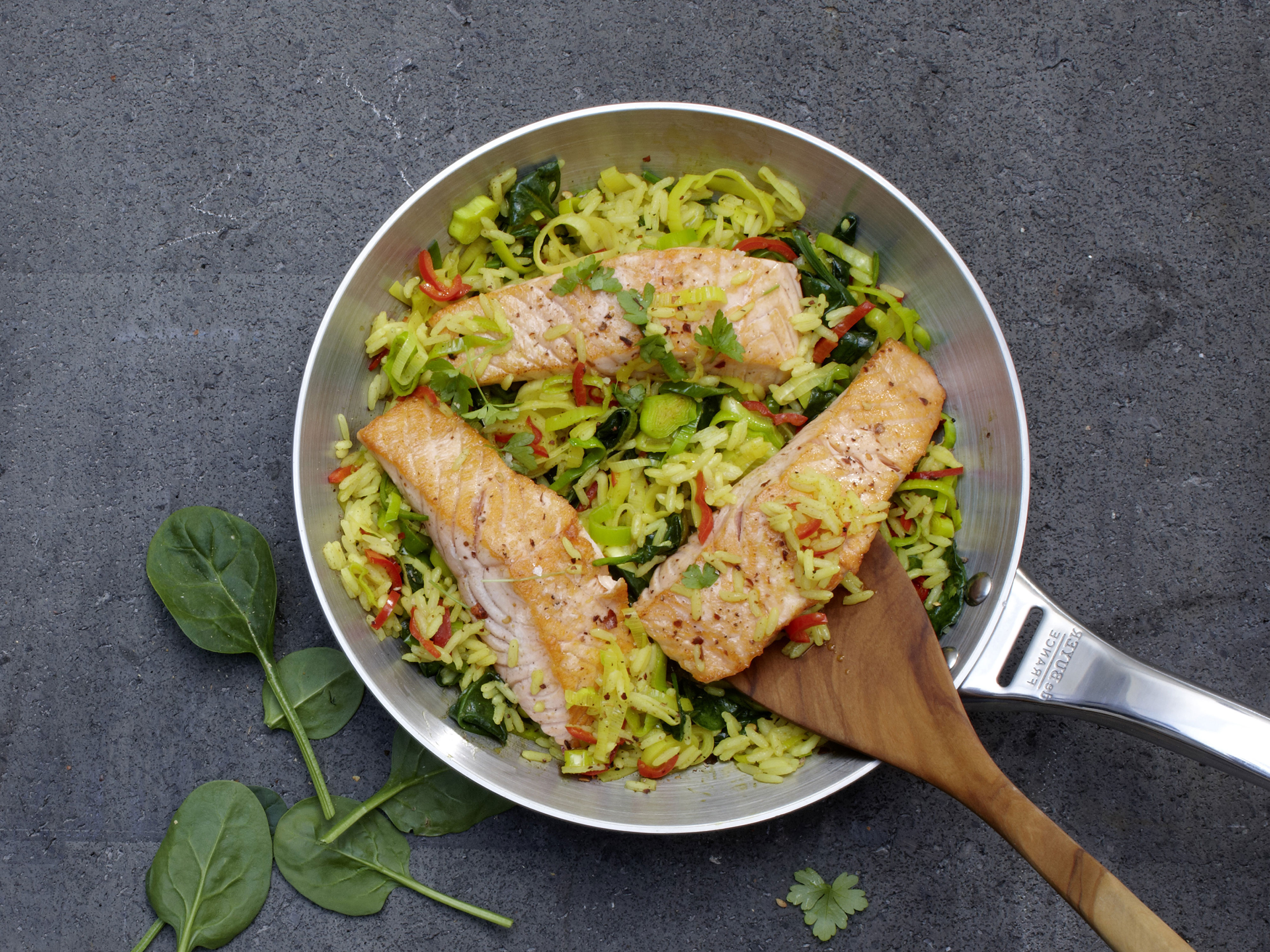 Den Reis unter die Gemüsepfanne heben und kurz darin erhitzen. Die Lachsfilets darauf leicht gefächert anrichten. Nach Belieben mit frischen Kräutern garniert servieren.