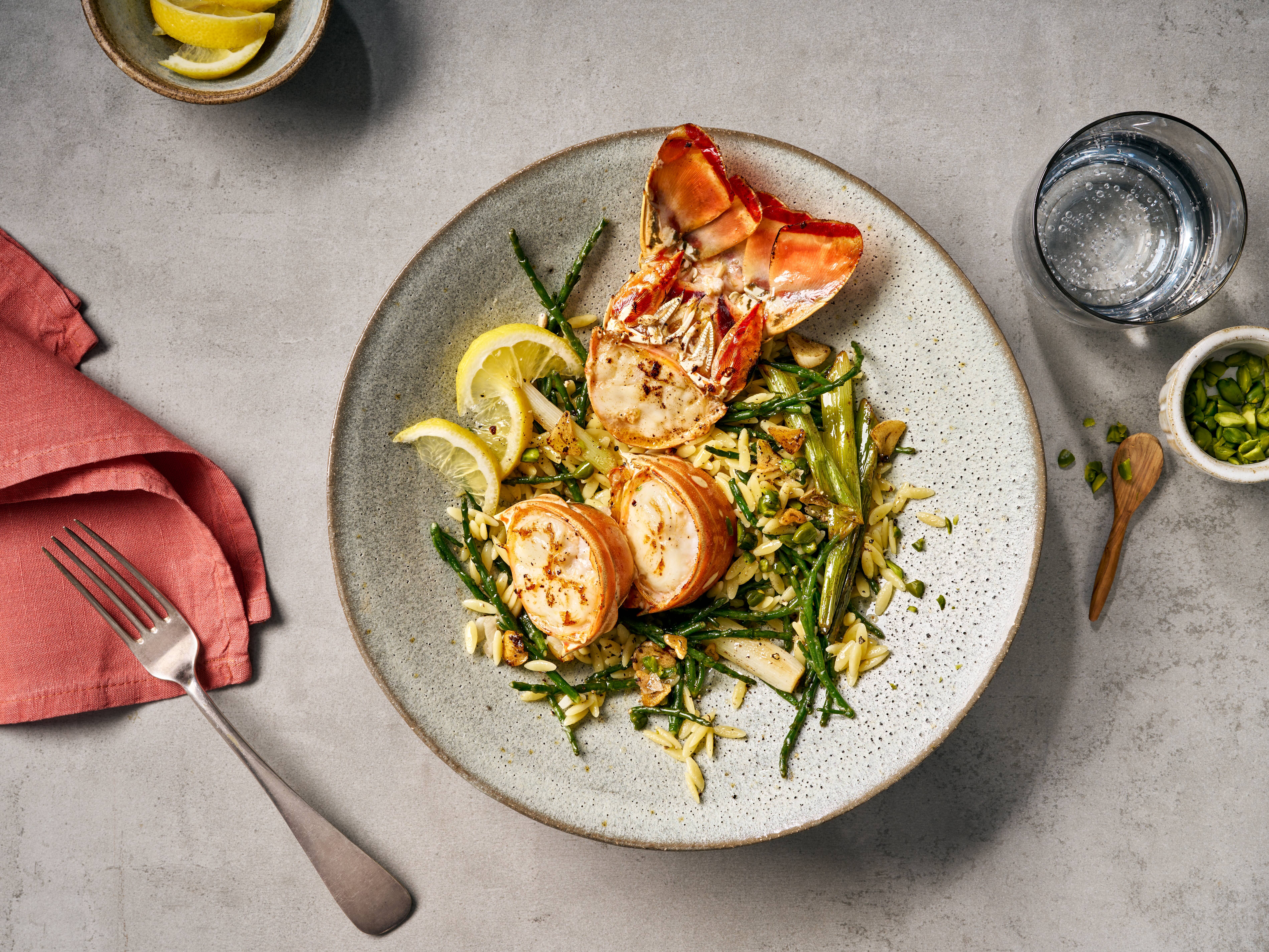 - 5 Kritharaki-Risotto anrichten und die Langusten-Medaillons darauflegen. Mit einigen Zitronenspalten garnieren und mit den gehackten Pistazien bestreuen.