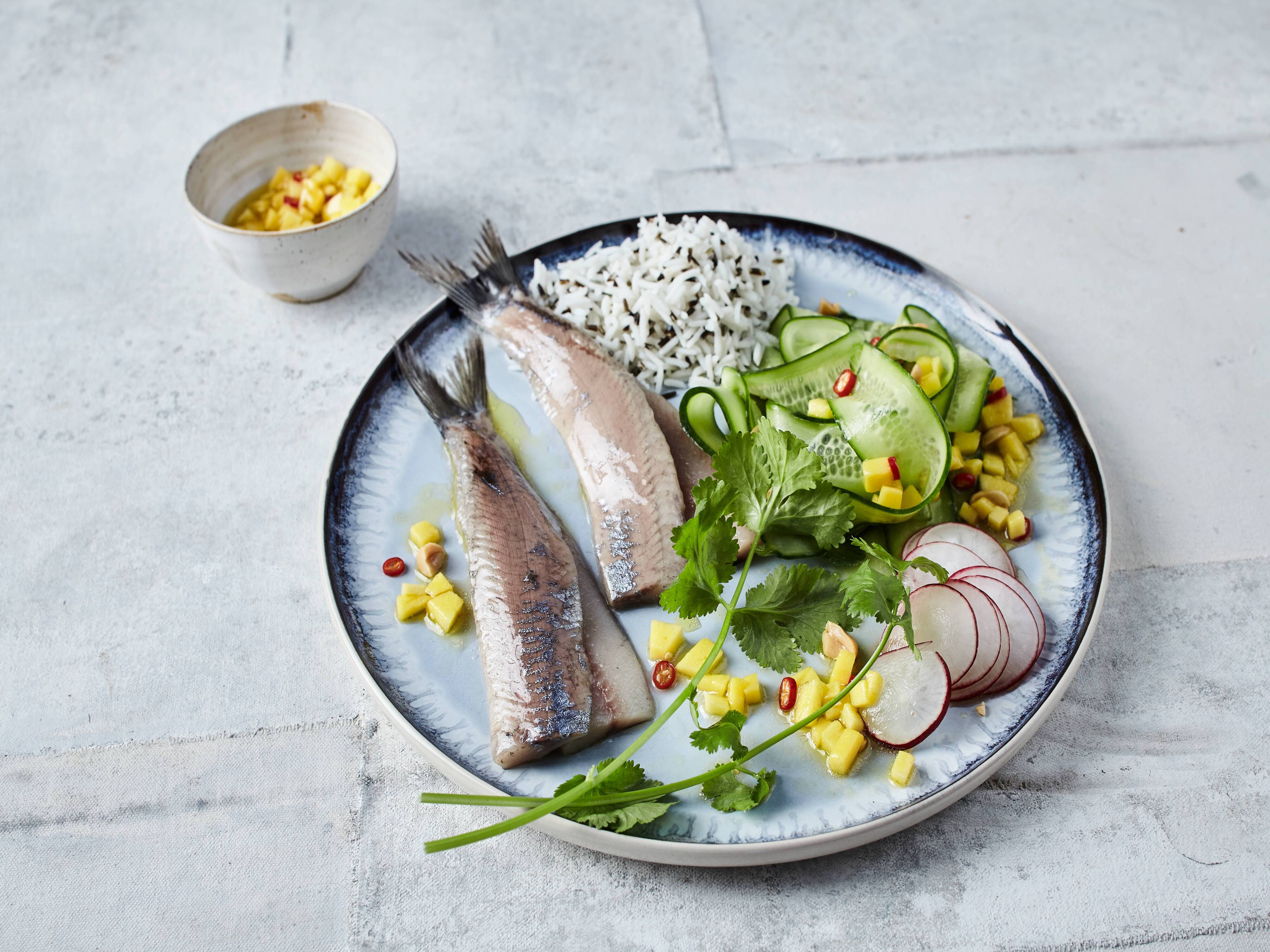 Matjes mit Mango-Gurkensalat und Reis