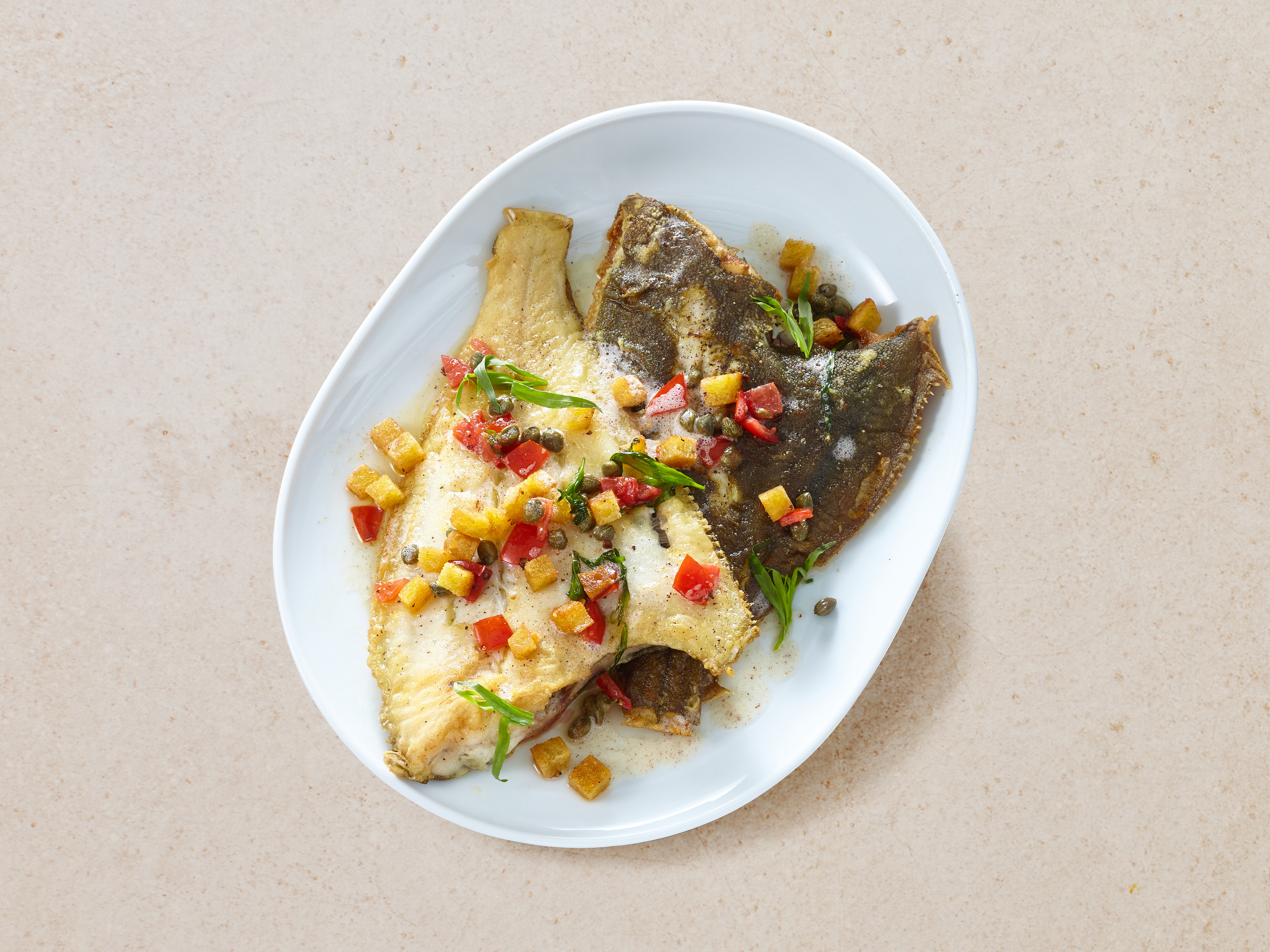 Nordseescholle trifft auf Mittelmeerfeeling: Gebratene Scholle mit Croûtons, Tomatenwürfeln, Kapern und Estragon.
