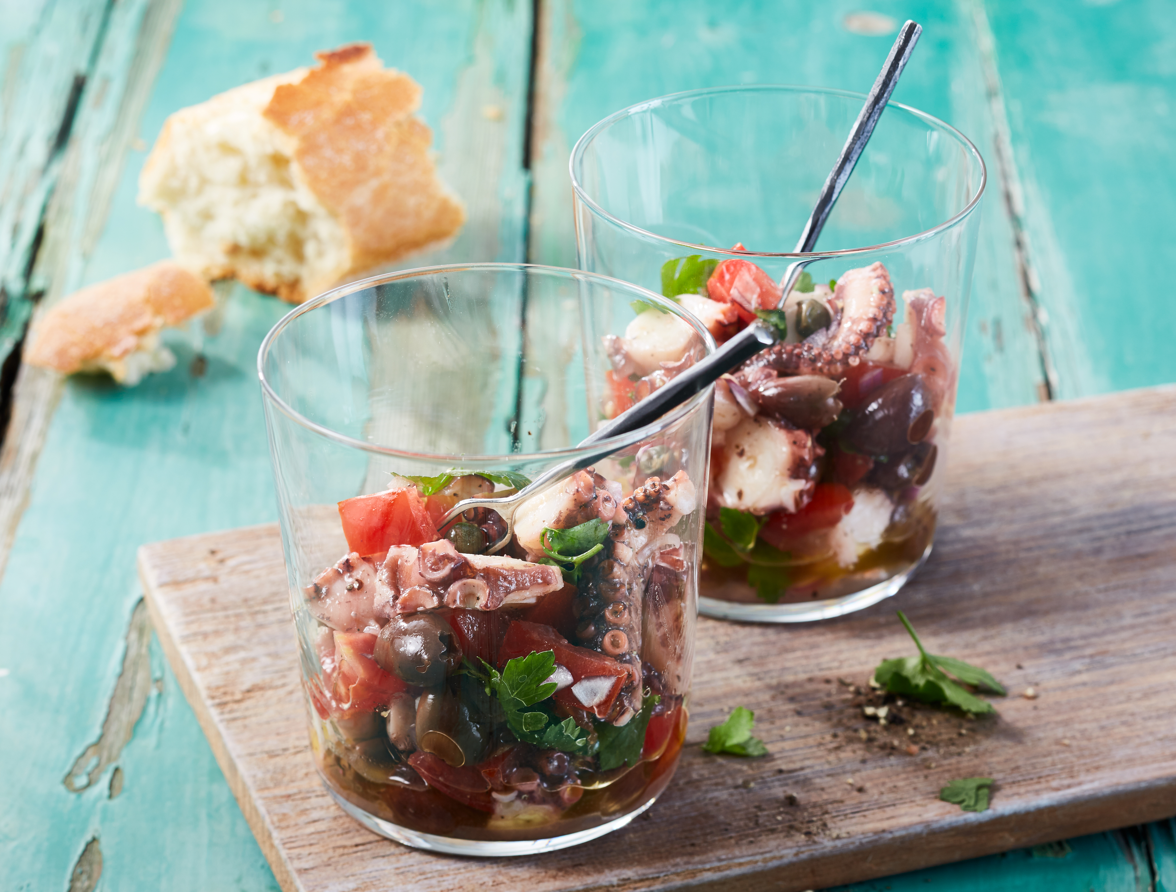 Pulpoarme gegebenenfalls über Nacht im Kühlschrank auftauen lassen. Pulpo in mundgerechte Stücke schneiden. Tomaten und Zwiebel würfeln und Petersilie grob hacken. Alles zusammen mit den Oliven vermischen. Mit Salz, Pfeffer, Olivenöl und Essig abschmecken. Salz etwas sparsamer als gewohnt verwenden.