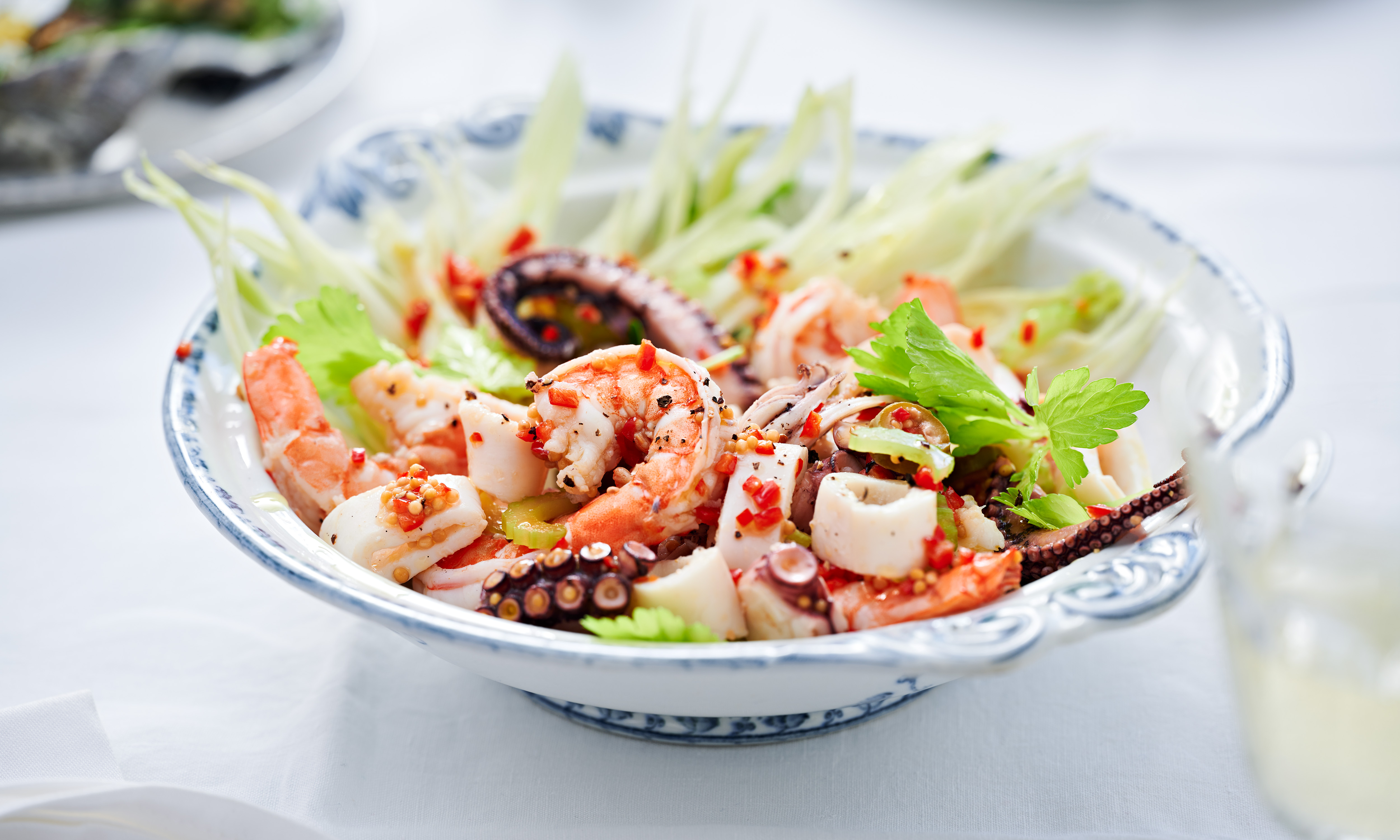 Frische Sommerküche: Meeresfrüchtesalat auf knackigem Fenchel, Staudensellerie und roter Paprika.