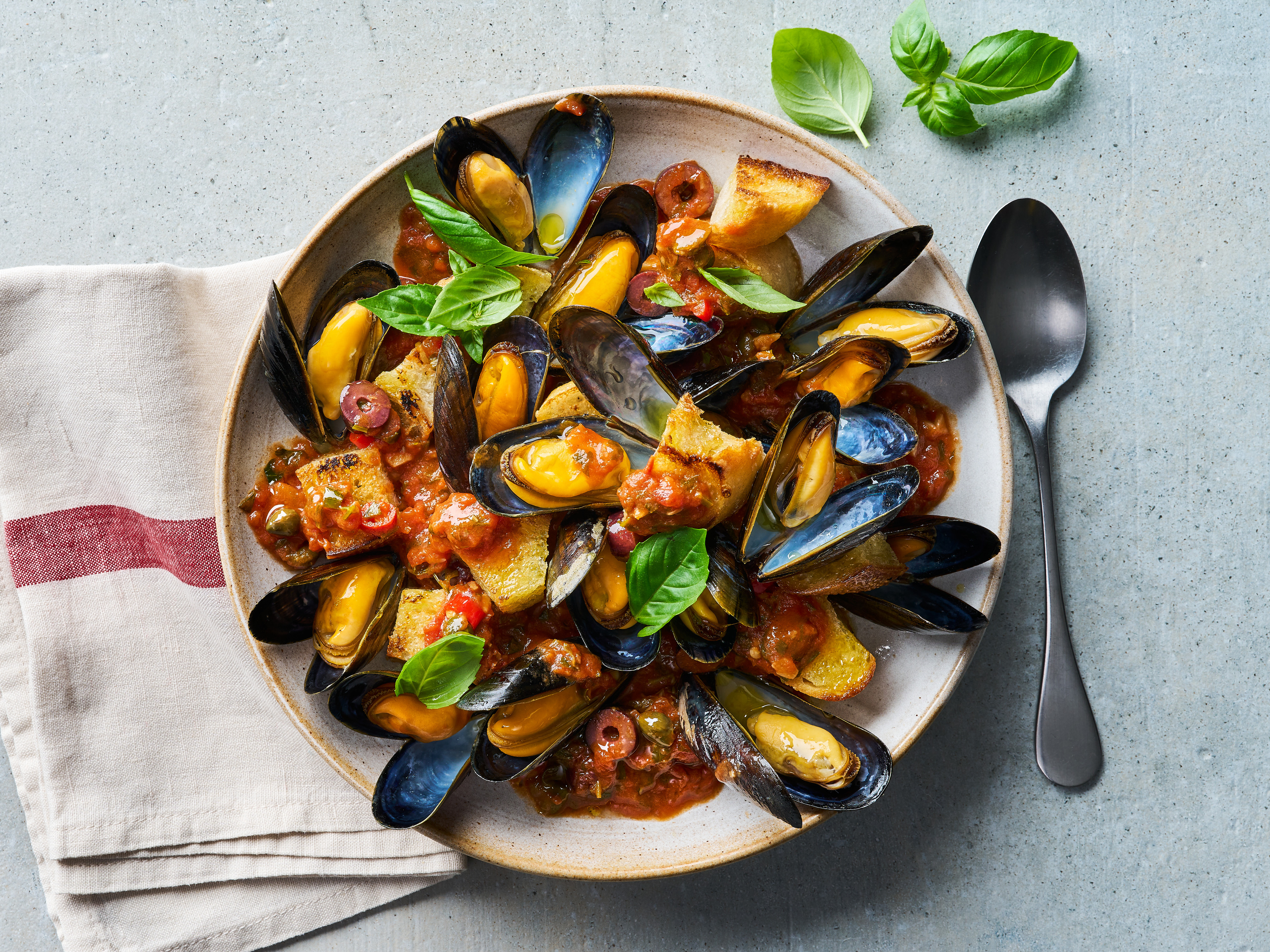 - 5 Brotwürfel mit 2 EL Olivenöl in einer Pfanne rösten und danach zusammen mit den Muscheln und der Tomatensauce anrichten. Mit Basilikumblättern bestreuen.