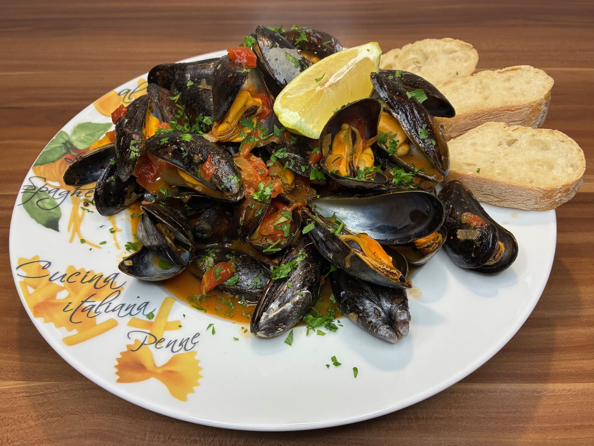 - 4 Muscheln mit Sauce in tiefen Tellern anrichten und mit frisch gehackter Petersilie bestreuen und mit knusprigem Baguette servieren.