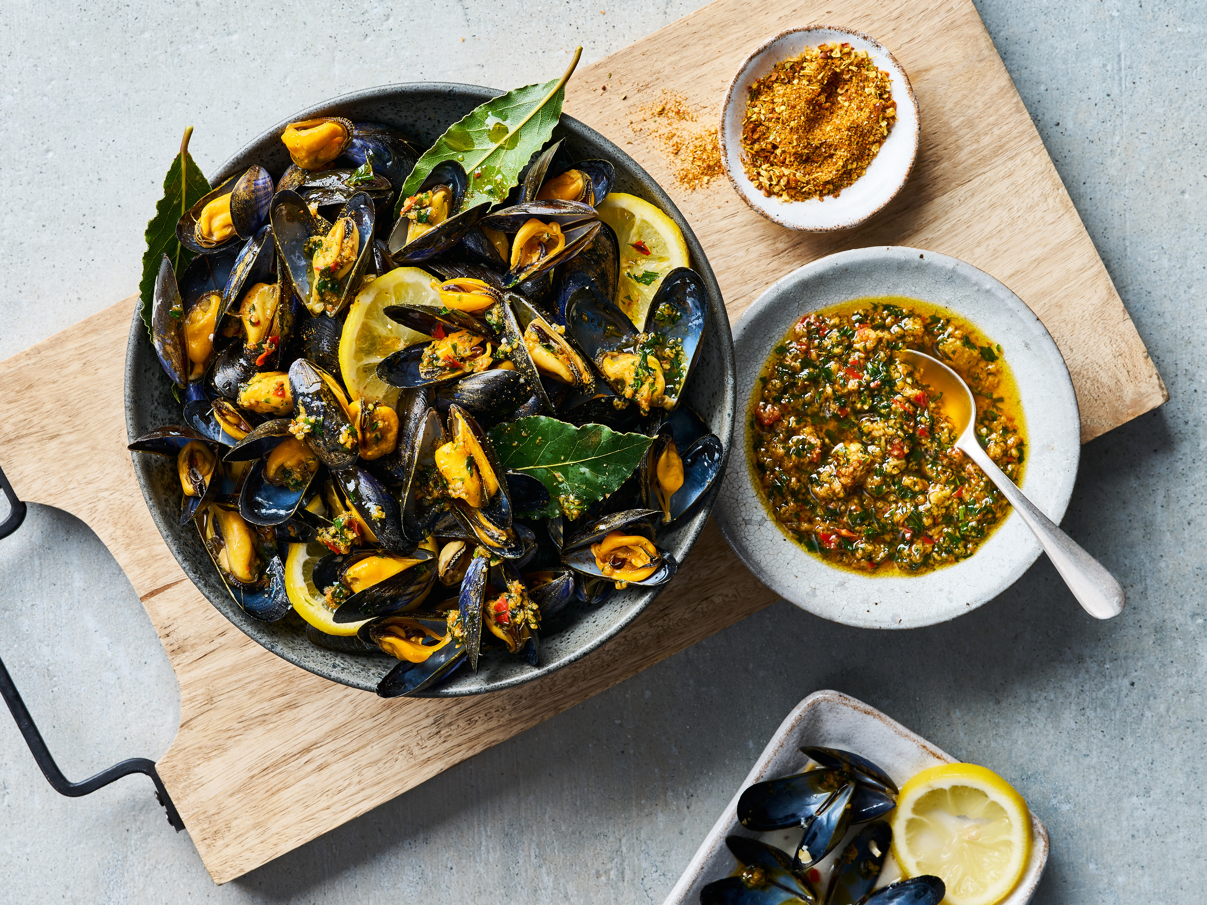 - 2 Zitrone in breite Scheiben schneiden. Das Pflanzenöl in einem großen Topf erhitzen. Muscheln und Lorbeerblätter zugeben, mit Zitronenscheiben belegen und mit Deckel ca. 5 Minuten garen. Die Muscheln sind fertig, wenn sie sich alle geöffnet haben. Ungeöffnete Muscheln aussortieren. Muscheln danach warmhalten.