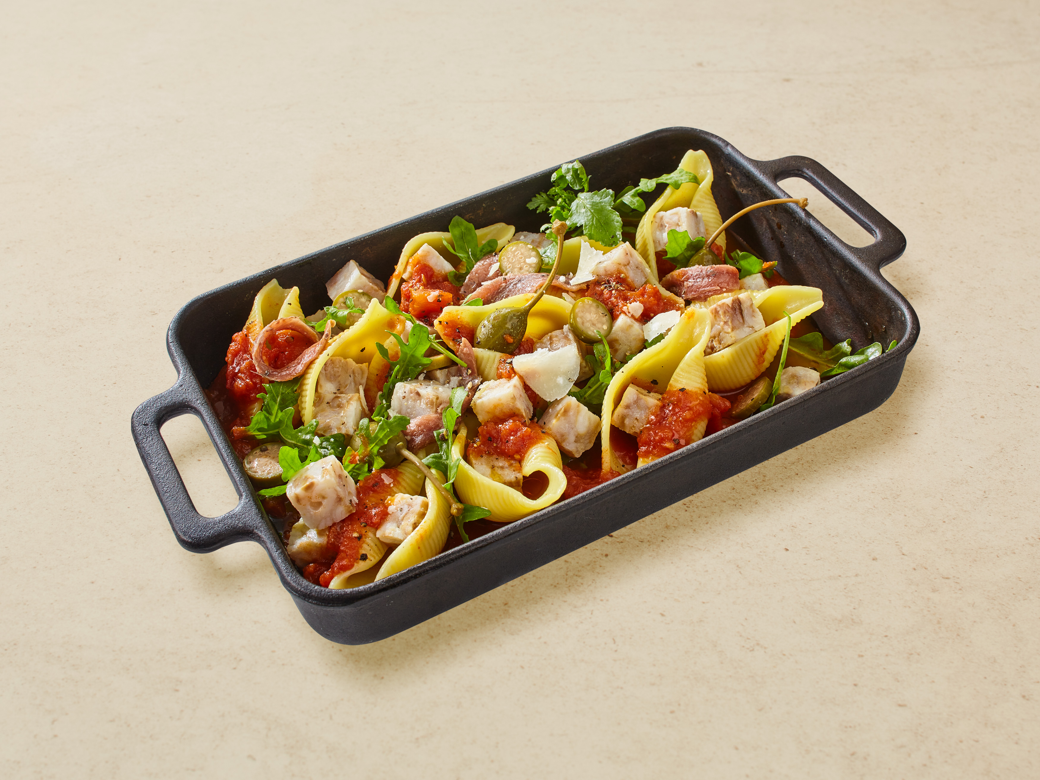 Für dieses italienische Nudelgericht kochen wir eine pikante Tomatensauce mit Sardellen, Alaska-Seelachsfilet und Kapern und garnieren mit frischen Kräutern, Parmesan und würzigen Kapernäpfeln.