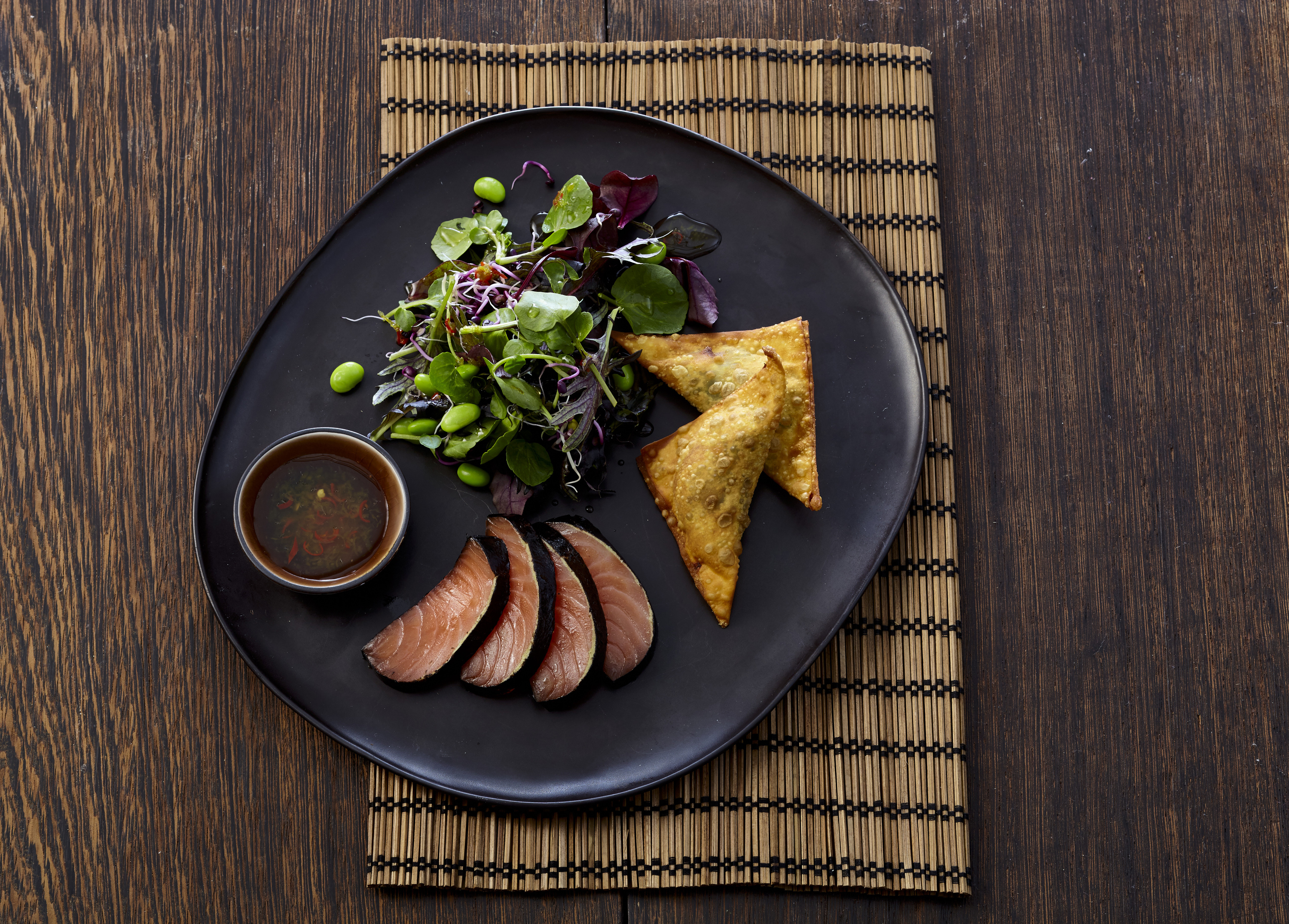 Für das Salatdressing die Limette heiß abwaschen, die Schale abreiben und den Saft auspressen. Zwei Esslöffel Limettensaft mit Fischsauce, Reisessig und Mirin aufkochen. Chili längs halbieren und die Samen entfernen. Das Fruchtfleisch der Chili in Streifen schneiden und zusammen mit dem Limettenabrieb in das Dressing geben. Dressing abkühlen lassen. Salatblätter, Sojabohnen und Sprossen mischen und mit dem Dressing anmachen. Nori-Lachs, Wan Tans und Salat zusammen mit Sojasauce servieren.