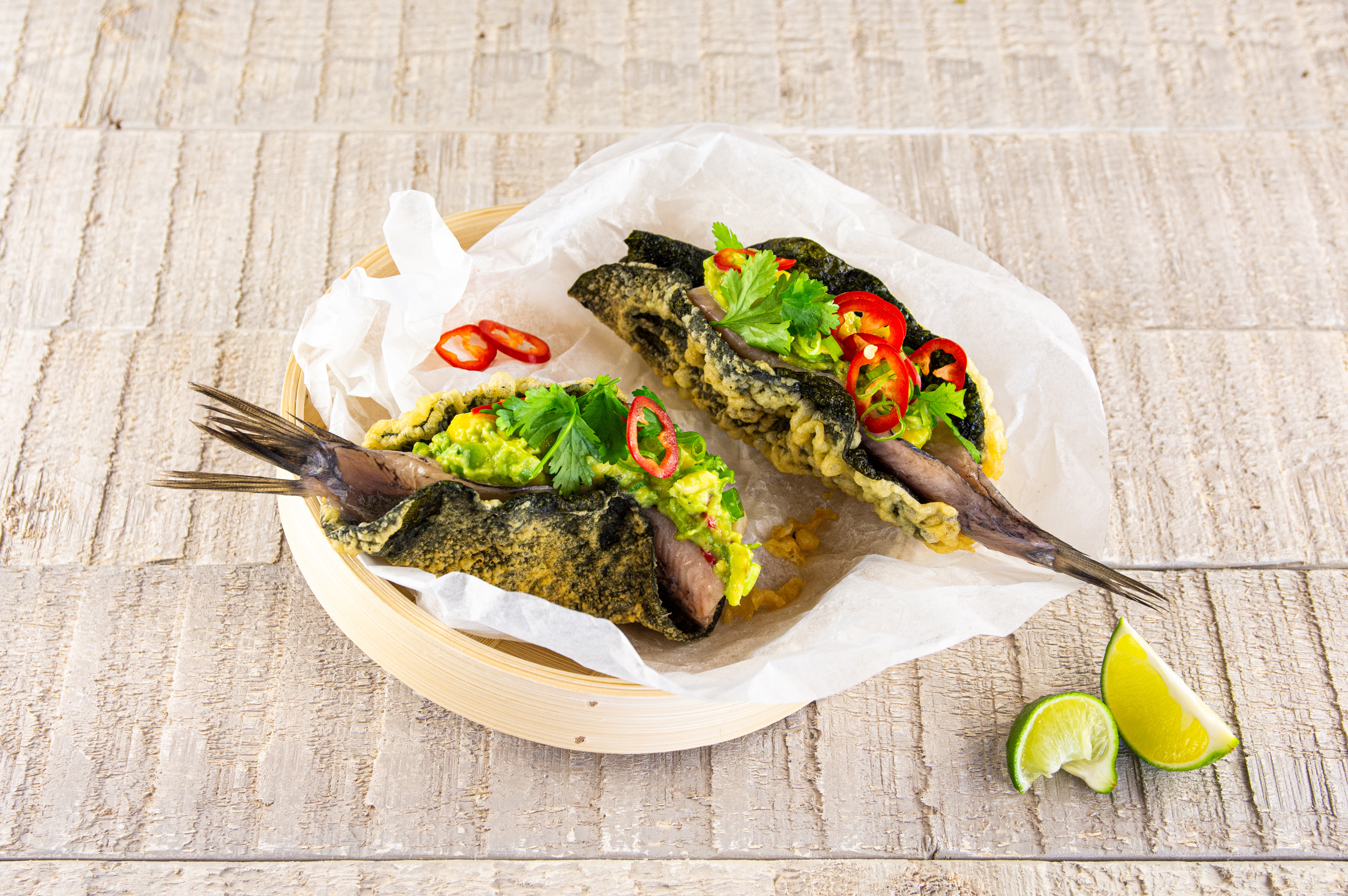 Internationales Fast Food: Taco Shells aus frittiertem Noriblatt mit mildem Matjes und fruchtiger Mango-Avocado-Guacamole gefüllt - so saftig und knusprig zugleich.