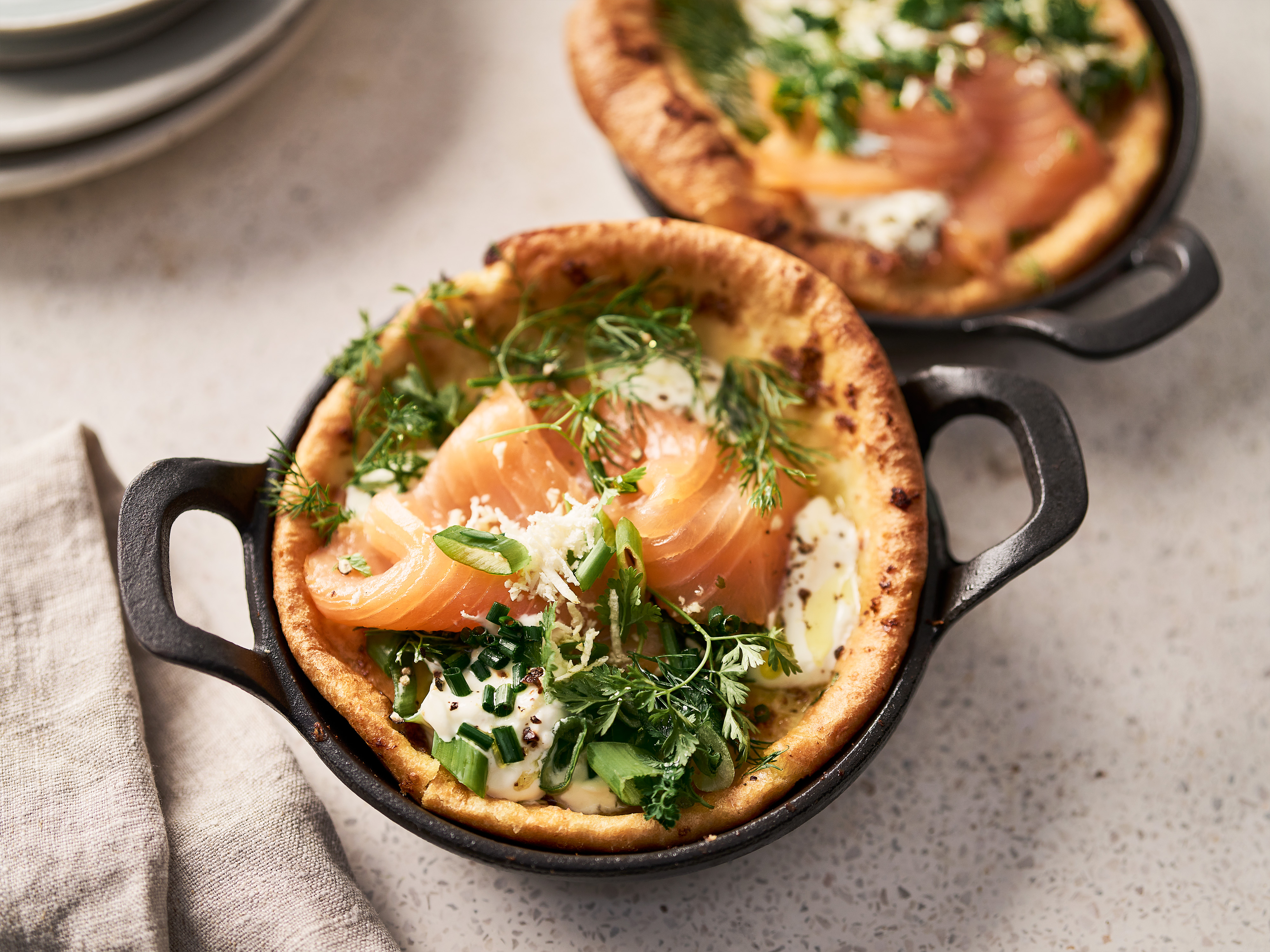 Herzhafte Pfannkuchen? Her damit! Wir garen die Eierkuchen unkompliziert im Ofen und bereiten in der Zwischenzeit die Toppings zu: Lachs, frische Kräuter und Crème fraîche.