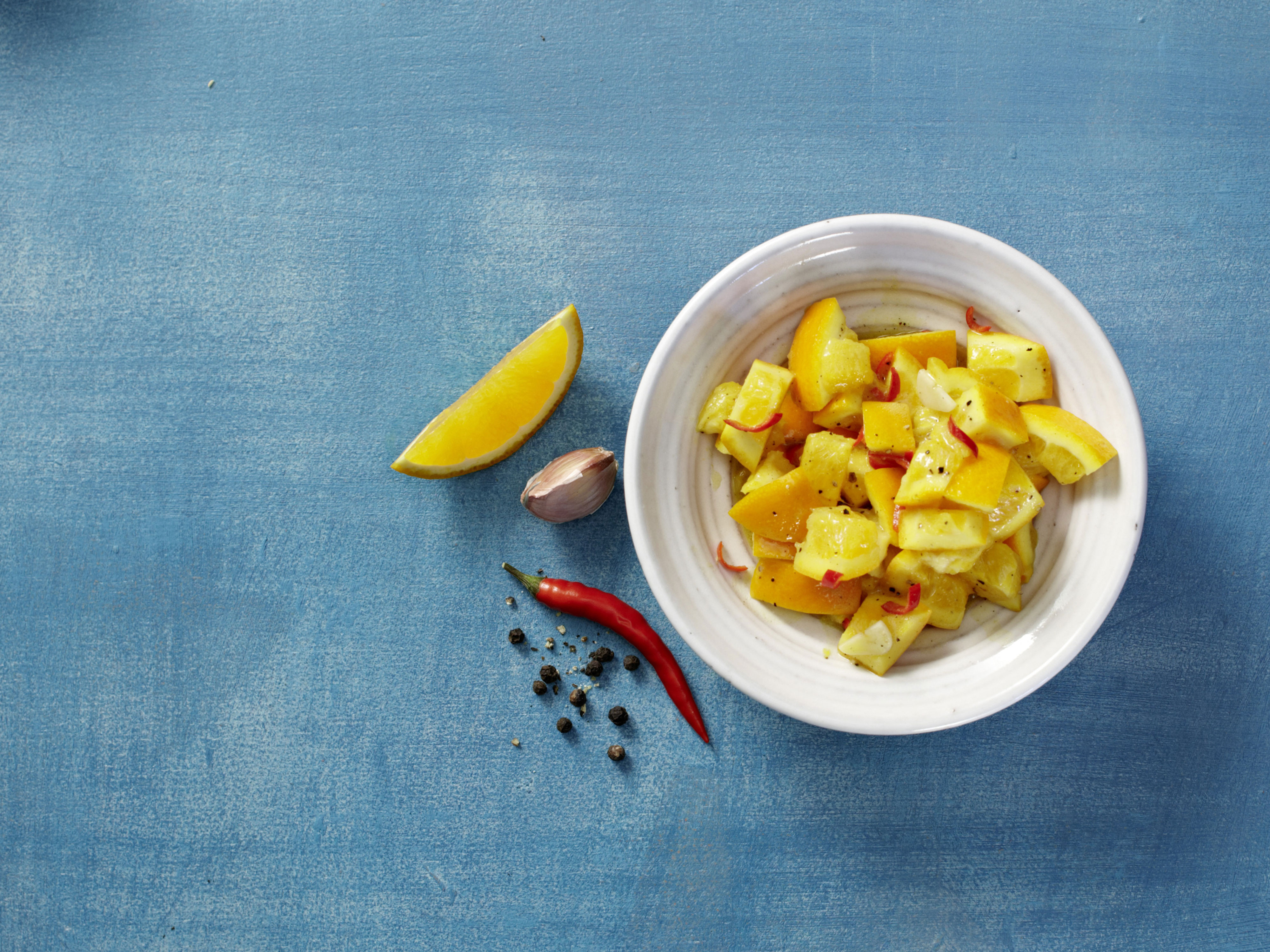 Die Orangen heiß waschen. Mit Schale in große Würfel schneiden und in eine Schüssel füllen. Chilischote der Länge nach halbieren, entkernen und in Streifen schneiden. Knoblauch schälen, in dünne Scheiben schneiden und mit den Chilistreifen zu den Orangen geben.