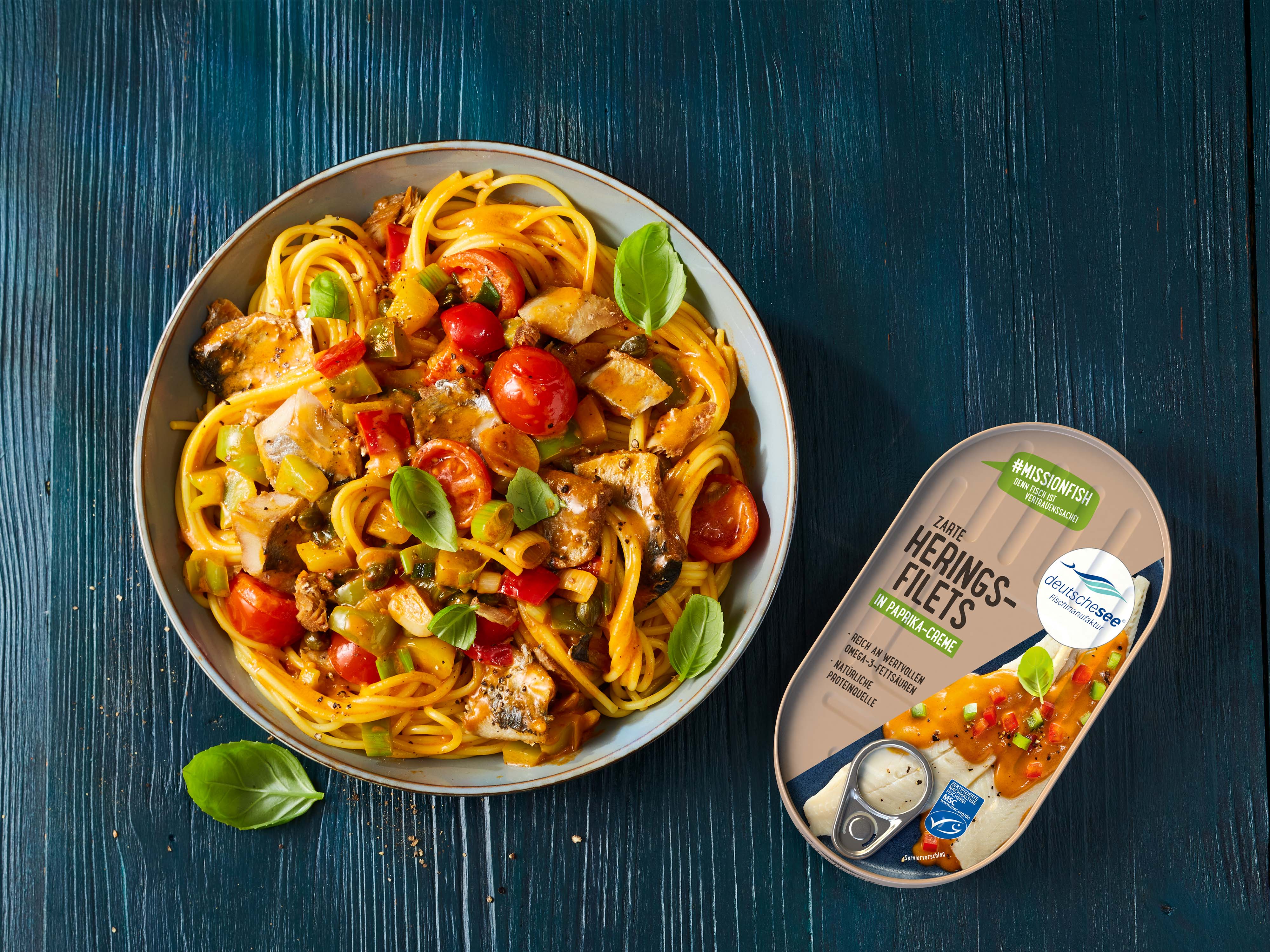 - 3 Heringsfilets mit einer Gabel in grobe Stücke teilen und zu der gegarten Paprika in den Topf geben. Alles locker vermengen, mit Salz und Pfeffer abschmecken und von der Hitze nehmen. Die Sauce mit restlichem heißen Nudelwasser zur gewünschten Konsistenz bringen.