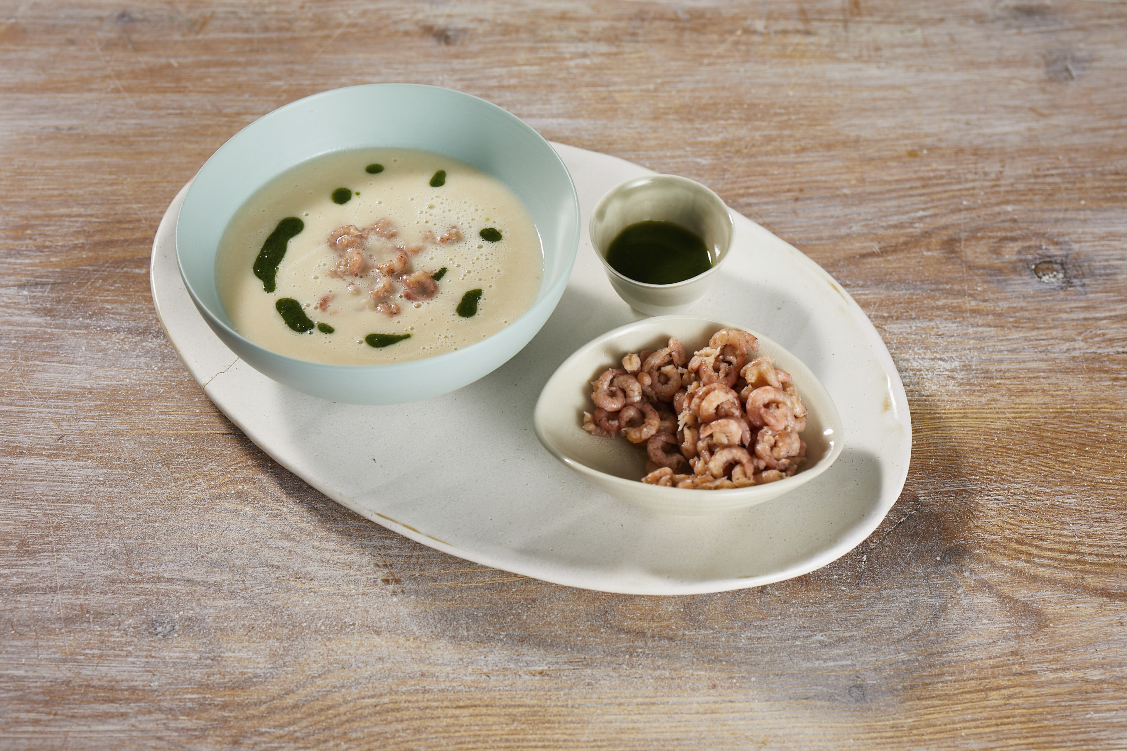 Ein wärmendes Süppchen für die kalten Wintertage: Cremige Suppe aus Petersilienwurzeln mit Krabben und selbstgemachtem Petersilienöl verfeinert.