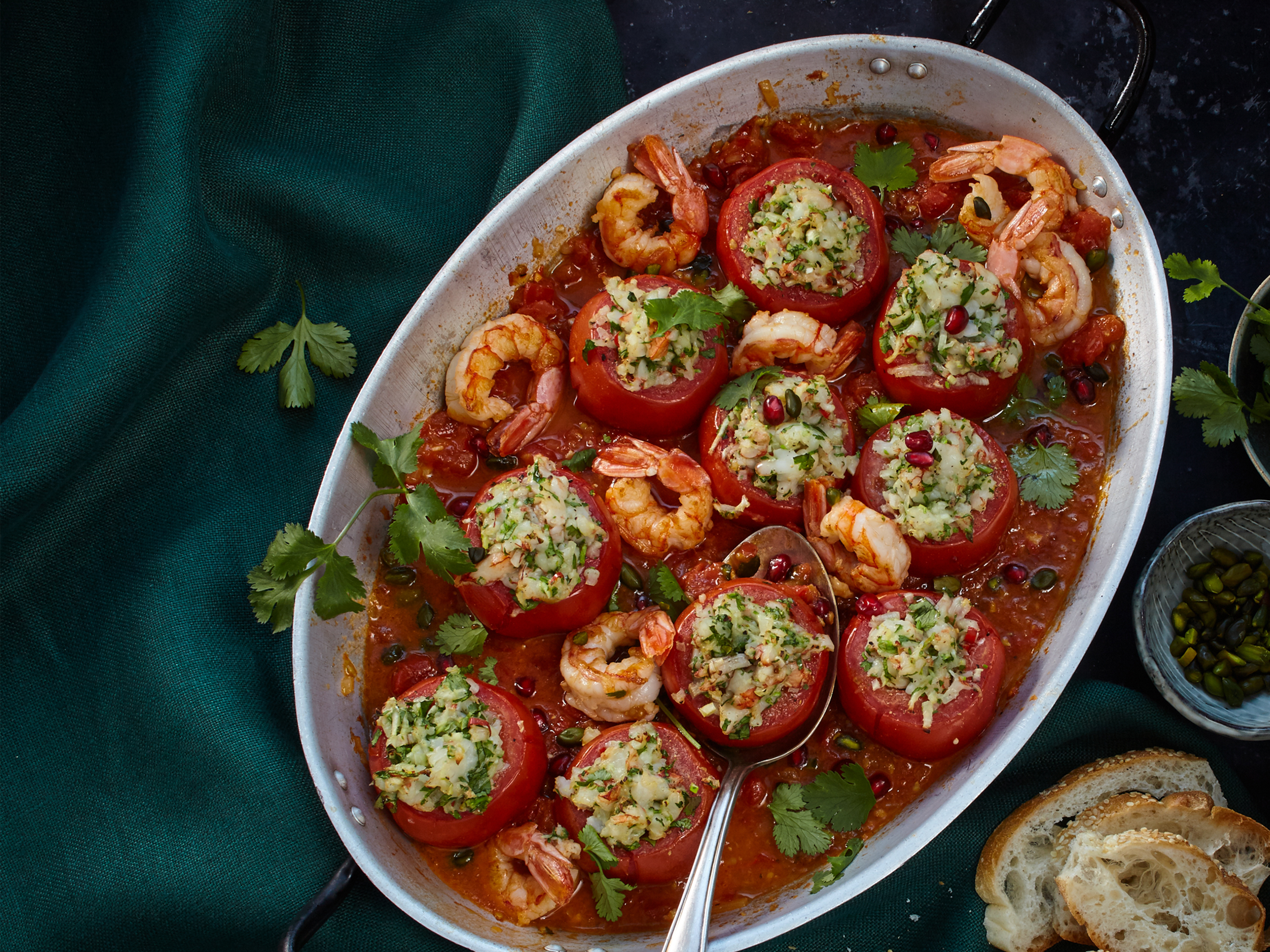 Garnelen aus dem Ofen: Das perfekte Gericht für eine große gemütliche Runde, denn die mit Garnelen gefüllten Tomaten schmoren im Ofen von alleine vor sich hin.