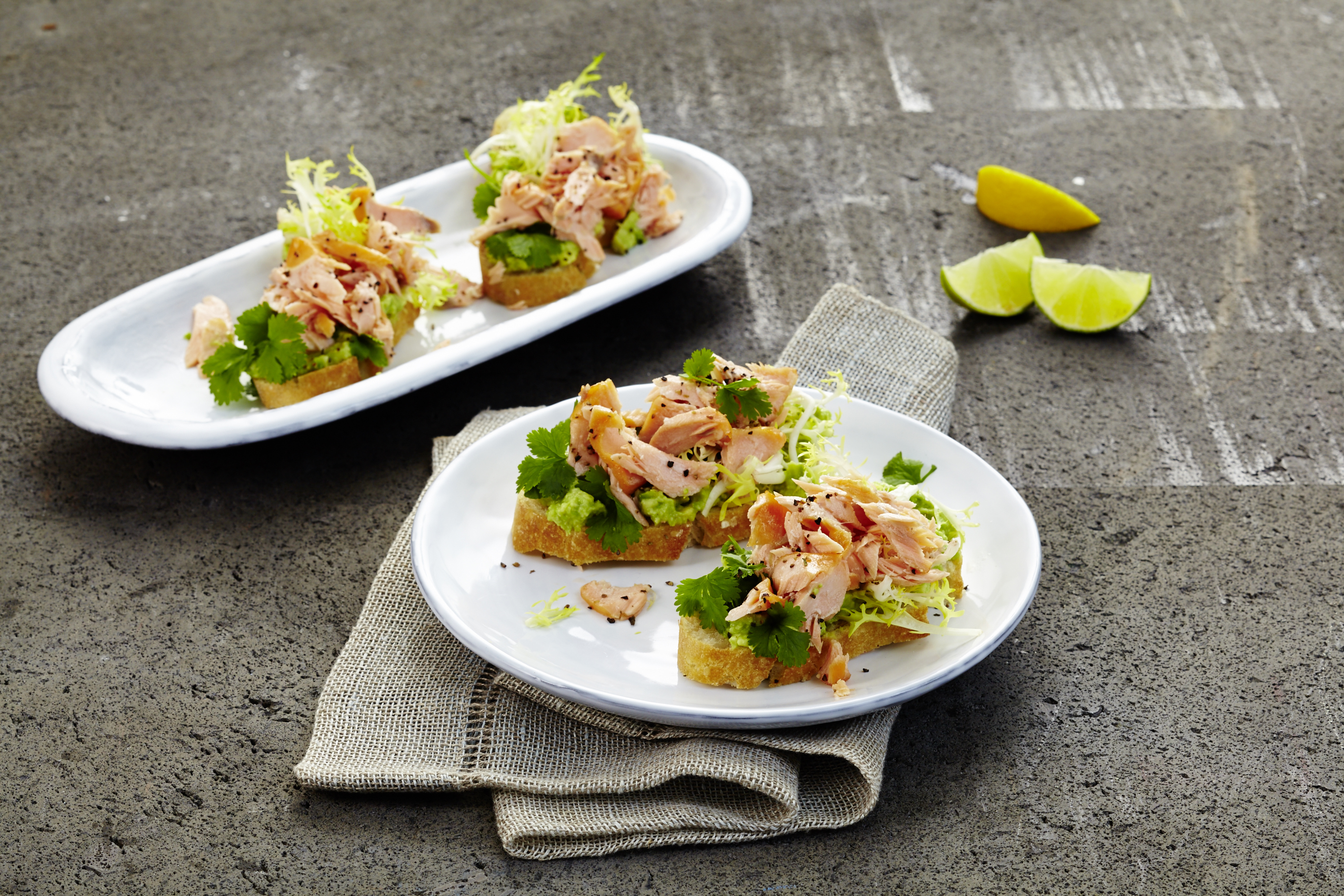 Die Guacamole auf die noch warmen Ciabattascheiben streichen und den Friseesalat und einige Korianderblätter locker darauflegen. Den gezupften Räucherlachs darauf verteilen.