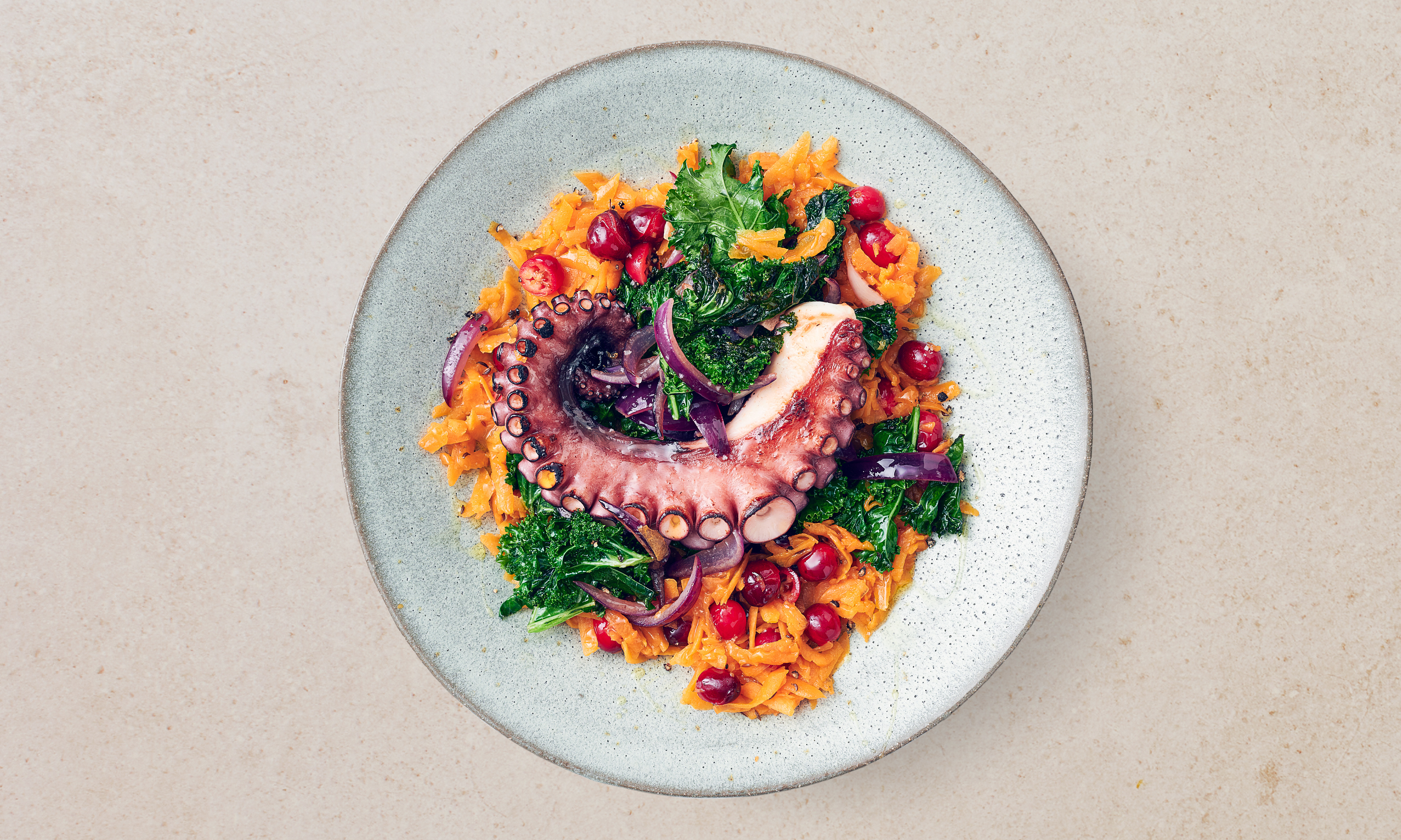 Pulpo schmeckt nicht nur im Sommer. Mit den winterlichen Zutaten Kürbis, Grünkohl und Cranberries ist der Krake auch in der kalten Jahreszeit außergewöhnlich lecker.