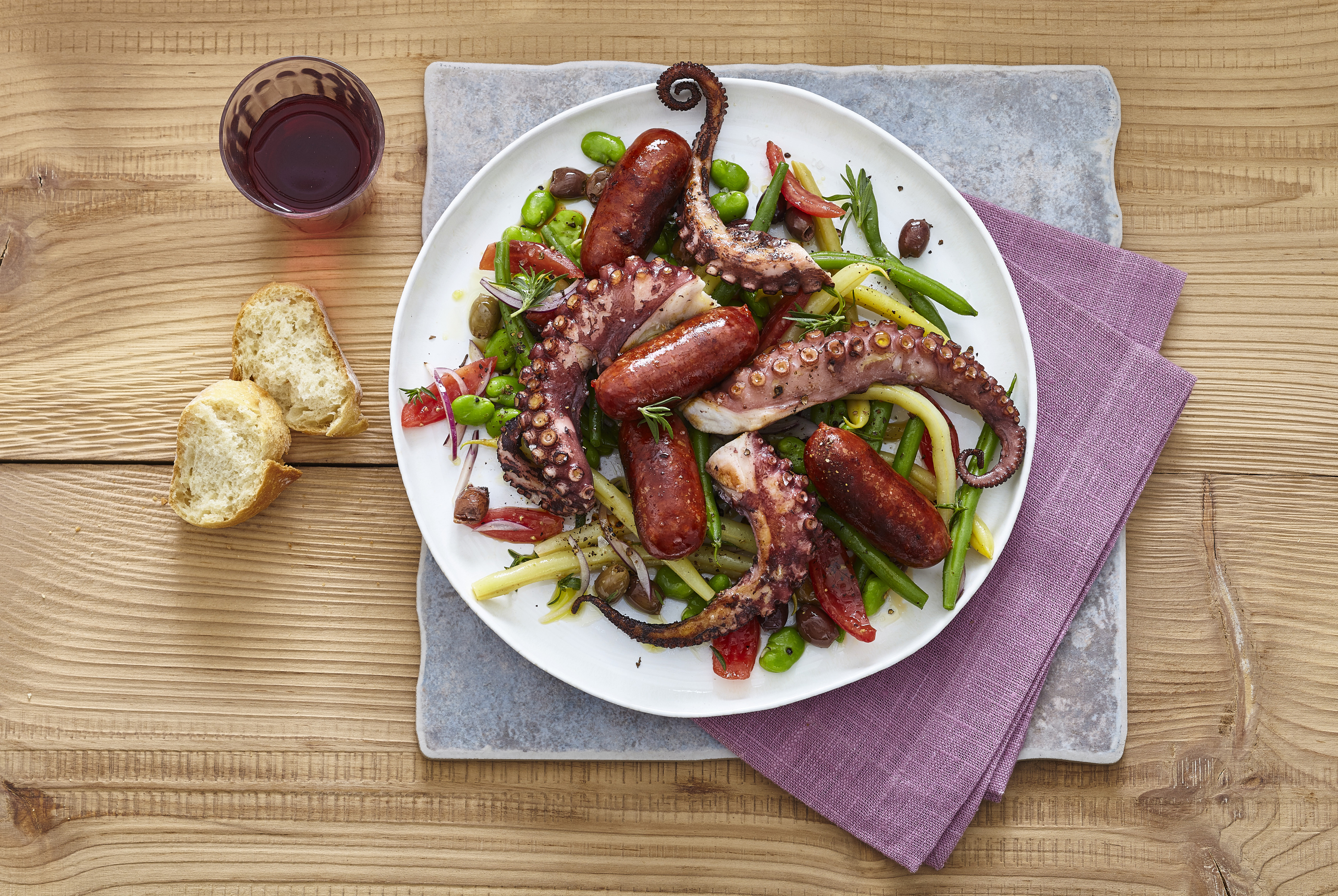 Jetzt wir’s bunt, mediterran und unbeschreiblich lecker: Pulpo & Chorizo mit dreierlei Bohnen, italienische Oliven und Tomaten.
