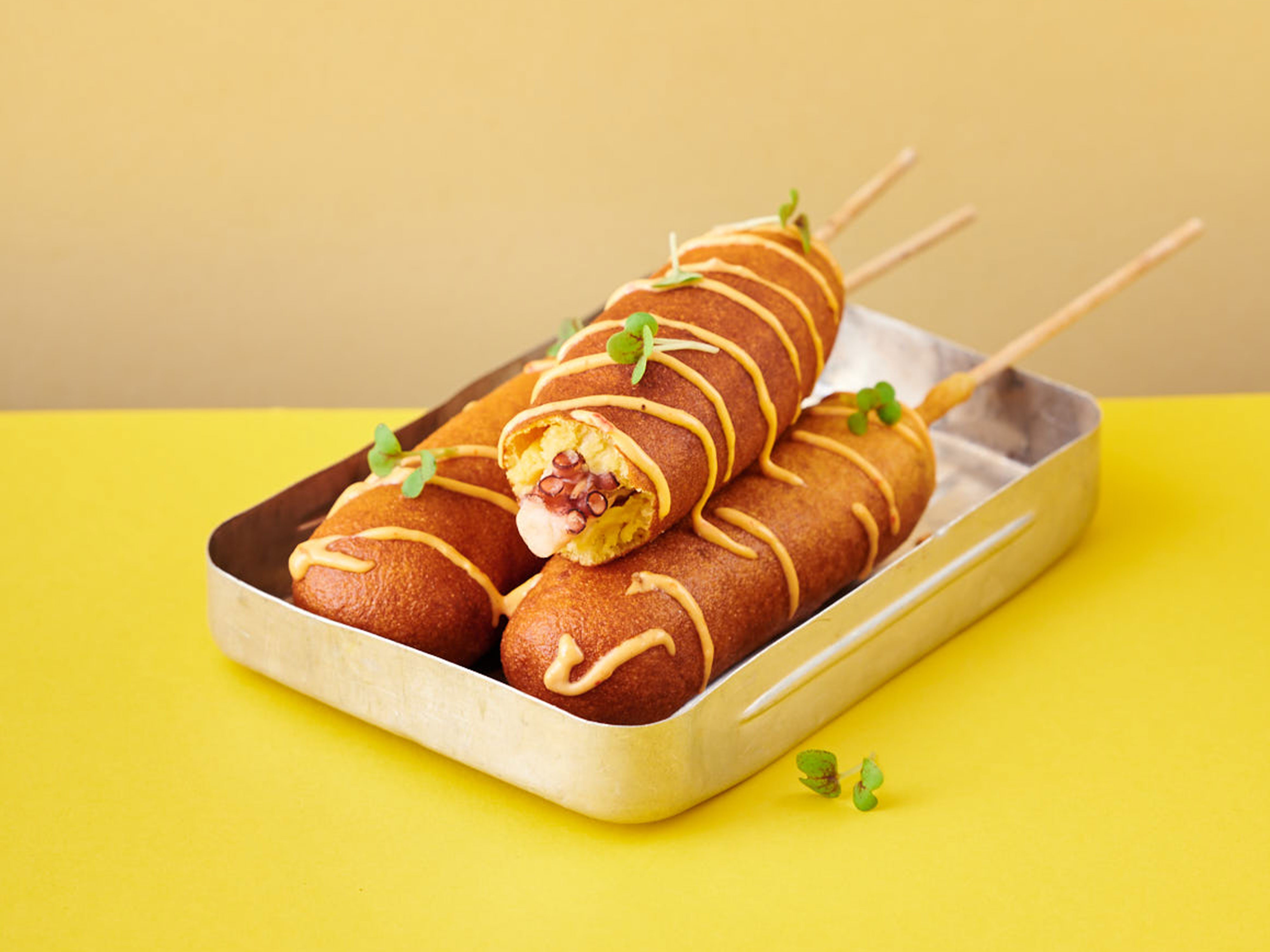 Bei dem typisch amerikanischem Imbiss werden normalerweise Würstchen im Teigmantel frittiert. Wir nehmen stattdessen Pulpo und servieren die Corn Dogs am Holzspieß mit Sriracha-Aioli.