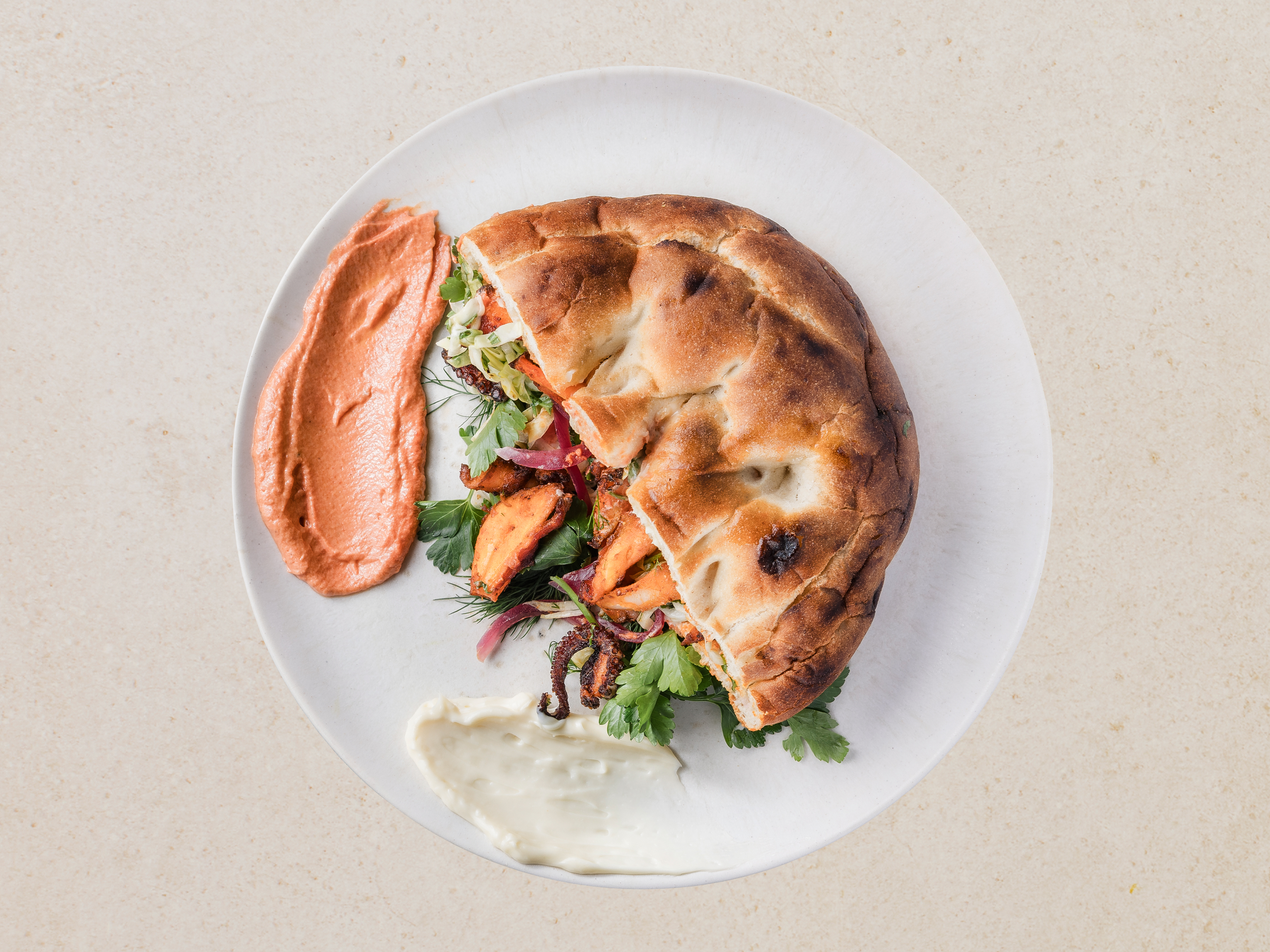 Fladenbrot mit Aioli und Tomaten-Crème fraîche bestreichen, Spitzkohl, Gurken, eingelegte Zwiebeln und Pulpo schichtweise einfüllen. Alles mit etwas Zitronensaft abrunden und servieren.