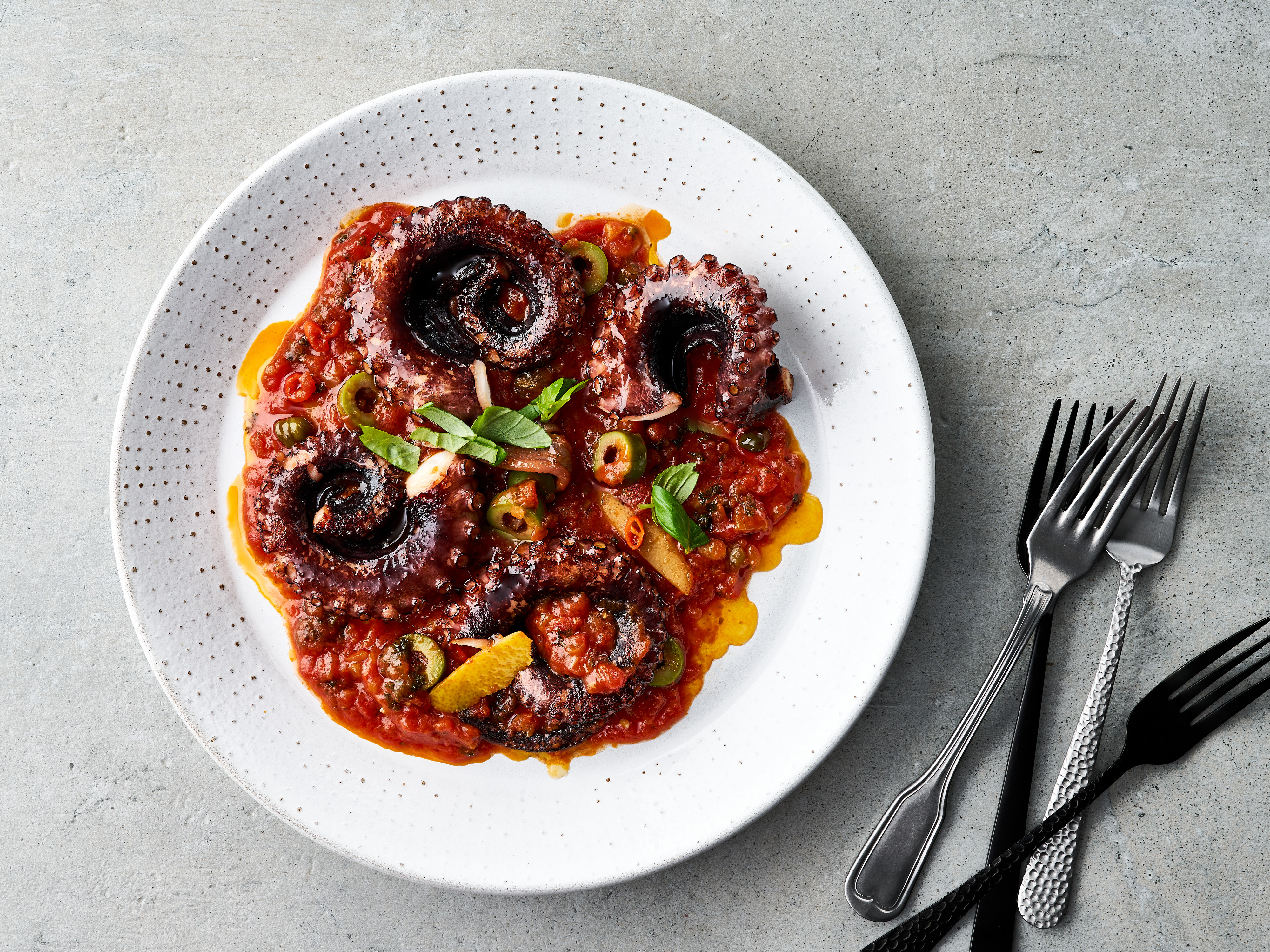 Parallel eine beschichtete Pfanne mit 2 EL Olivenöl erhitzen und die Pulpoarme bei niedriger Hitze ca. 8-10 Minuten kross braten. Dabei öfter wenden und mit Salz würzen. Pulpoarme mit der Sauce anrichten und mit grob geschnittenem Basilikum bestreuen.