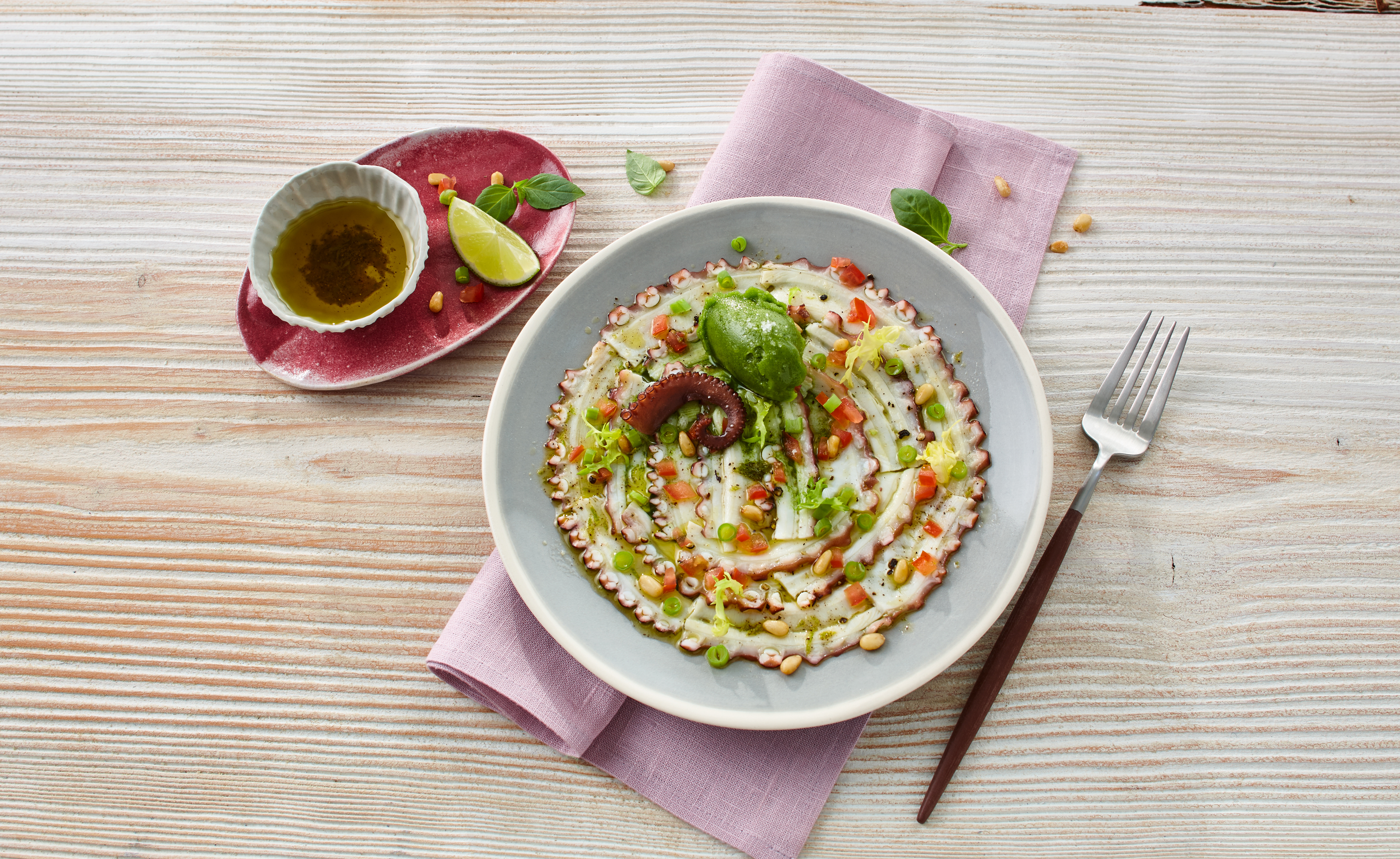 Mediterrane Vorspeise: Dünn aufgeschnittener Pulpo mit Limettenöl und Tomatenwürfel. Für den Frischekick on top sorgt das Basilikumsorbet.