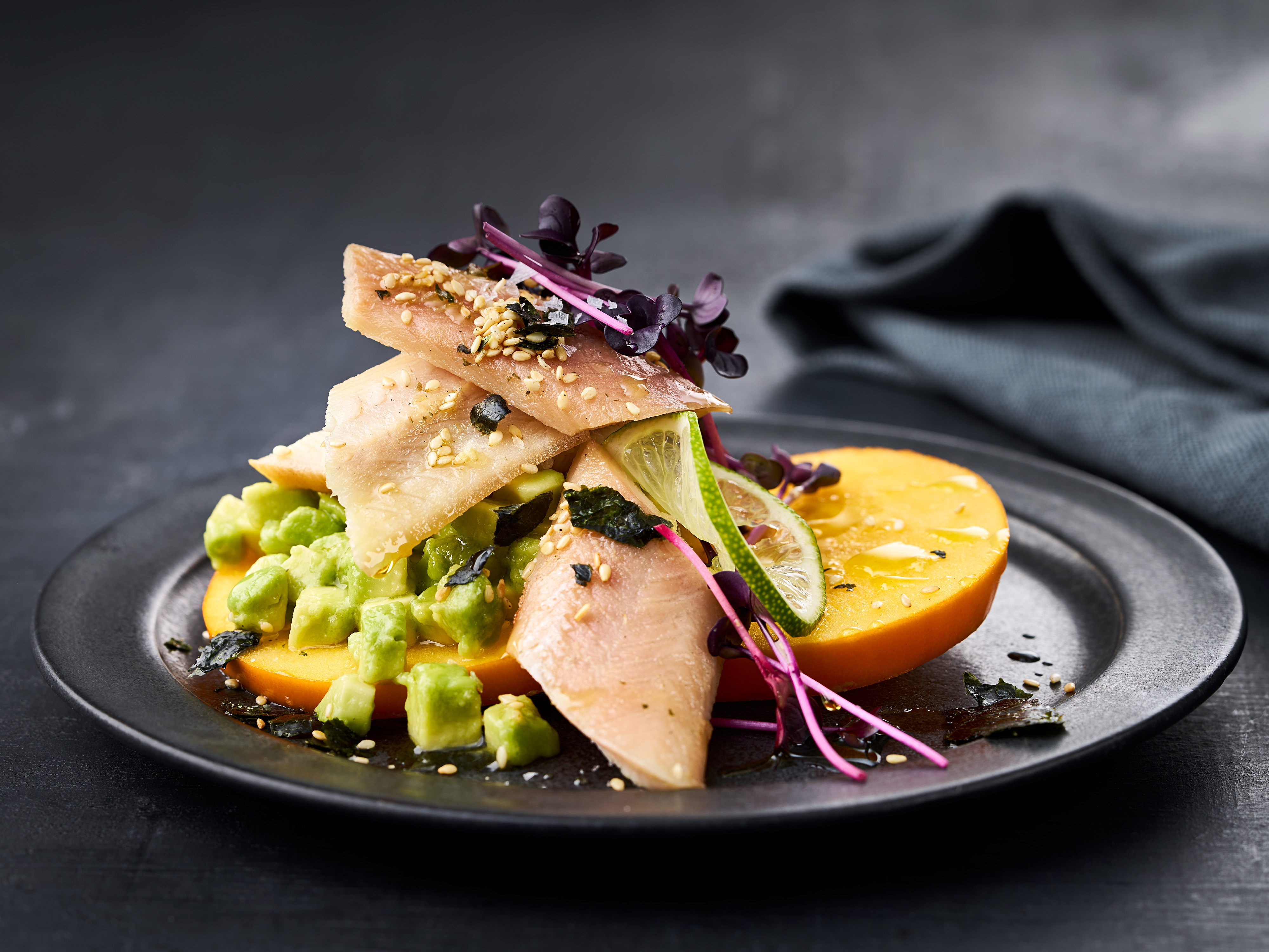 Geräucherter Aal und Avocadotatar auf fruchtig-süßer Kaki, verfeinert mit Nori-Sesam-Topping und Limette.
