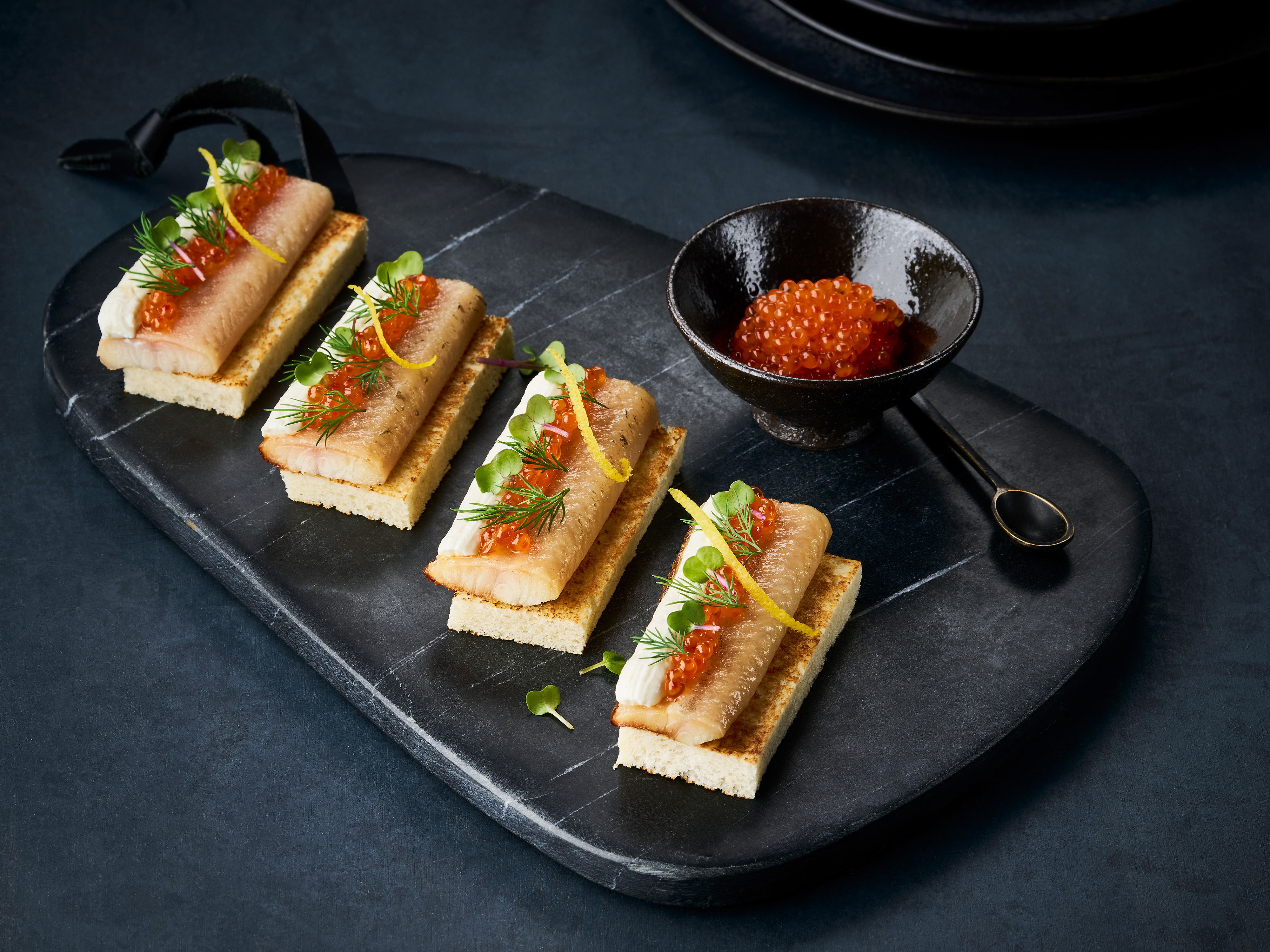 Sehen aus wie ein funkelndes Kunstwerk, sind aber ganz easy gemacht: grafisch belegte Schnittchen mit Filets vom Aal und Forellenkaviar.