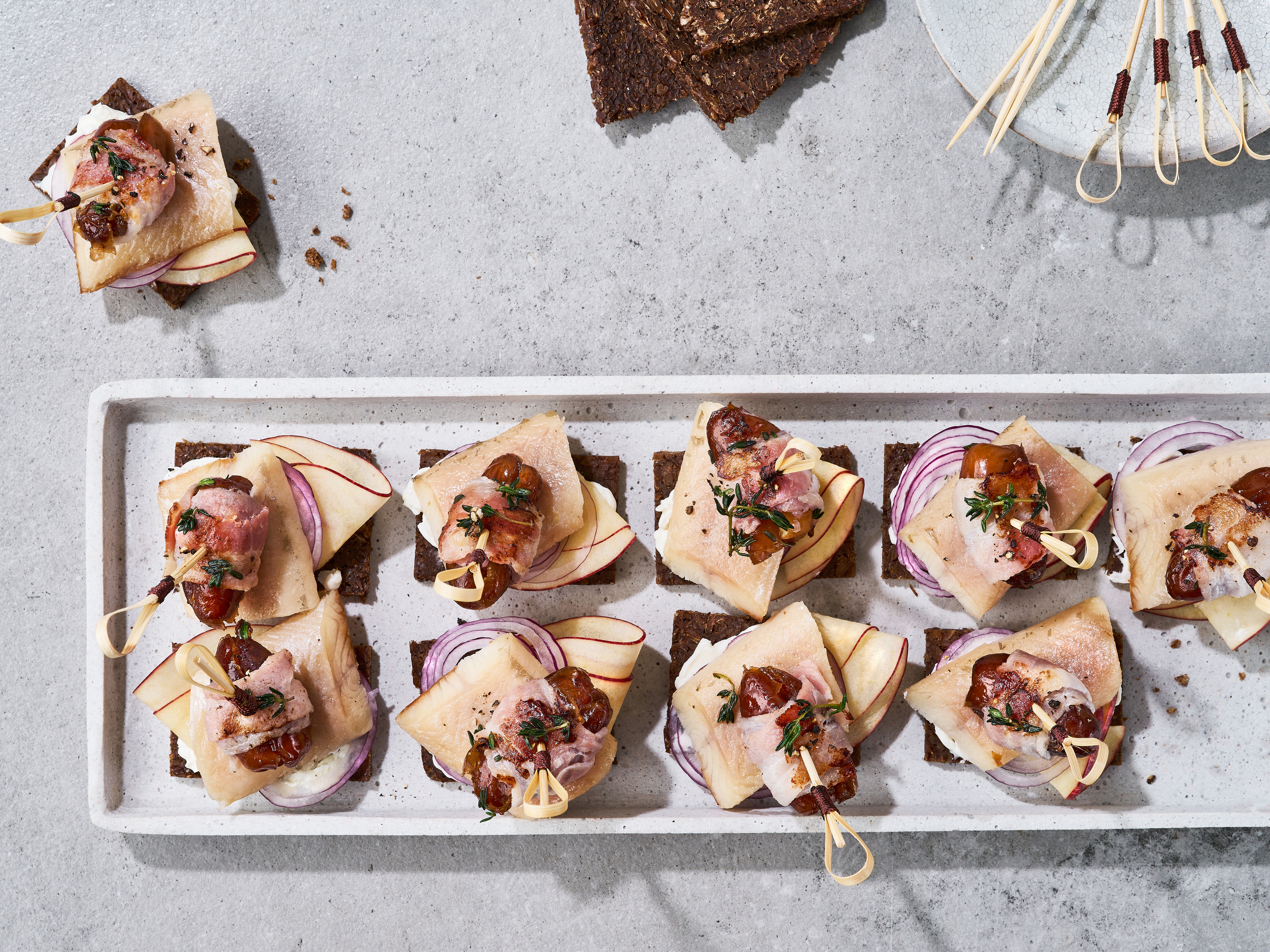 - 3 In einer Pfanne das Öl erhitzen und die Datteln im Speckmantel darin einige Minuten von allen Seiten braten. Thymian klein zupfen und kurz mitbraten. Jeweils 1 Dattel mit einem kleinen Spieß auf jedes belegte Brot stecken und alles mit grob zerstoßenem Pfeffer bestreuen.