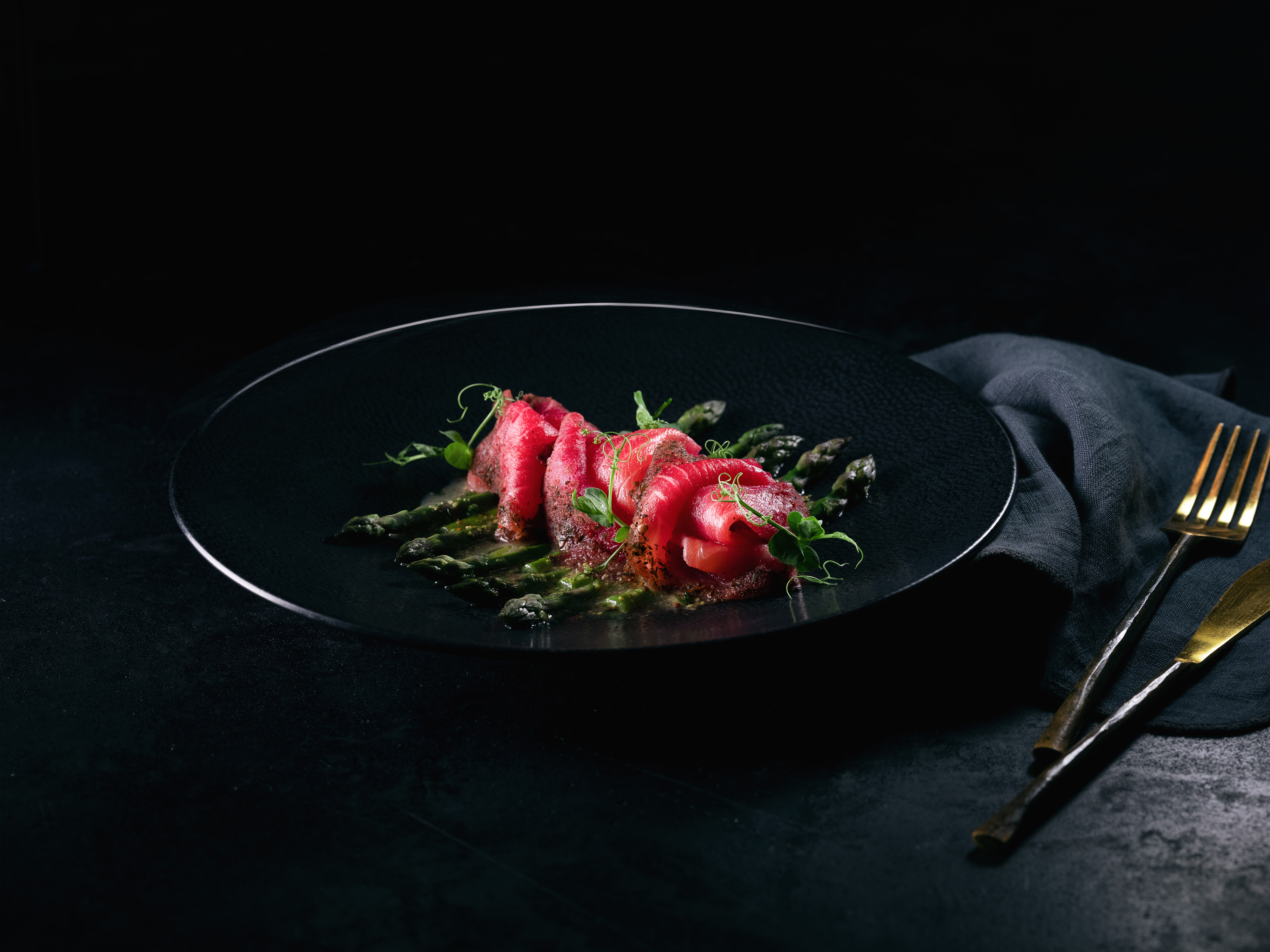 Die perfekte Komposition: Unser geräucherter Rote Bete-Wacholder-Lachs, frischer Spargel und die süß-nussige Vinaigrette greifen optisch und geschmacklich harmonisch ineinander.