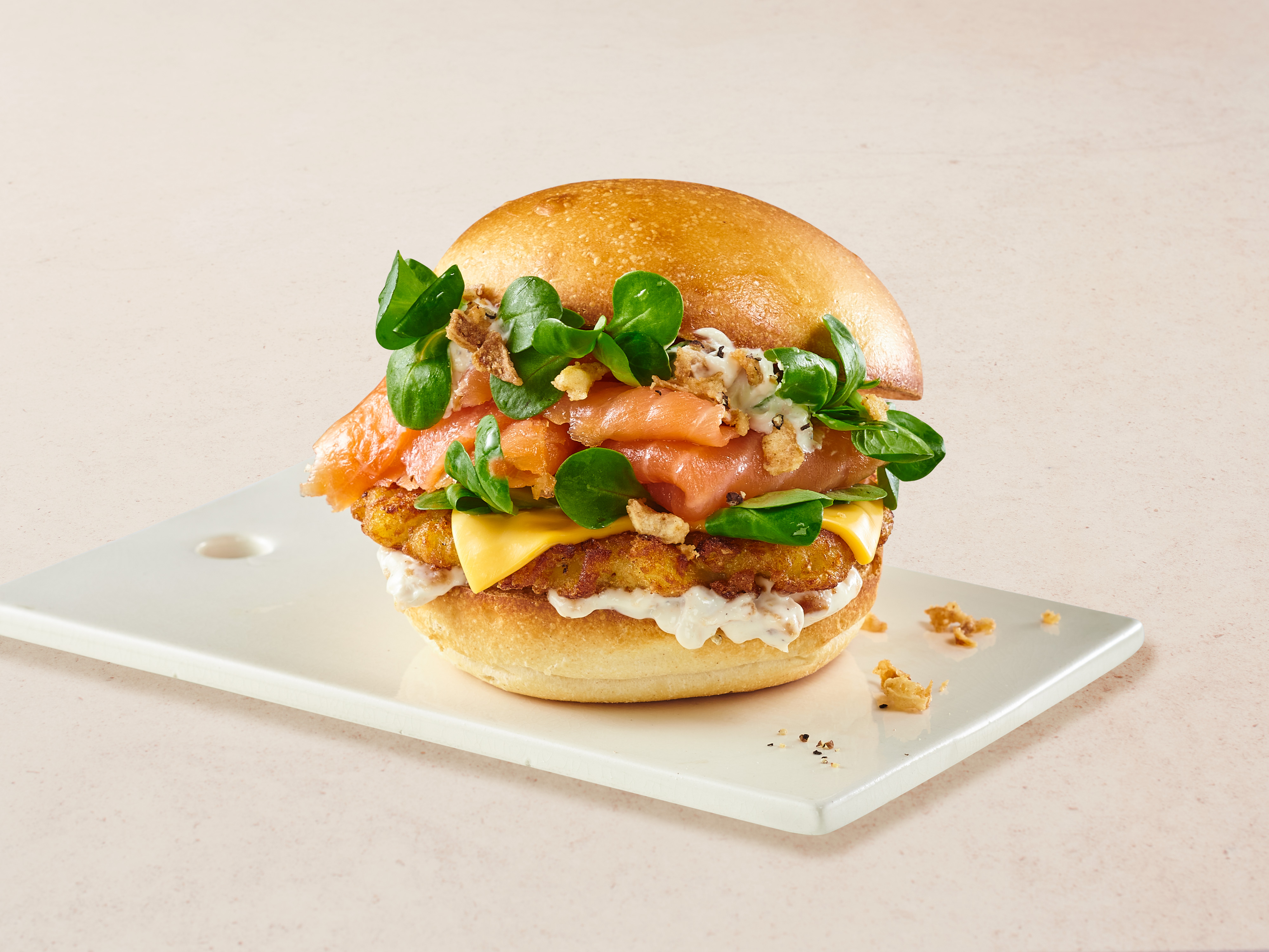 - 3 Die Röstzwiebel-Mayonnaise auf allen Brötchenhälften verteilen. Rösti auf die unteren Hälften legen und etwas Feldsalat darauf verteilen. Nun die Lachsscheiben locker darüberlegen und wieder etwas Feldsalat darauf anrichten. Alles mit Röstzwiebeln bestreuen, mit den oberen Brötchenhälften bedecken und servieren.