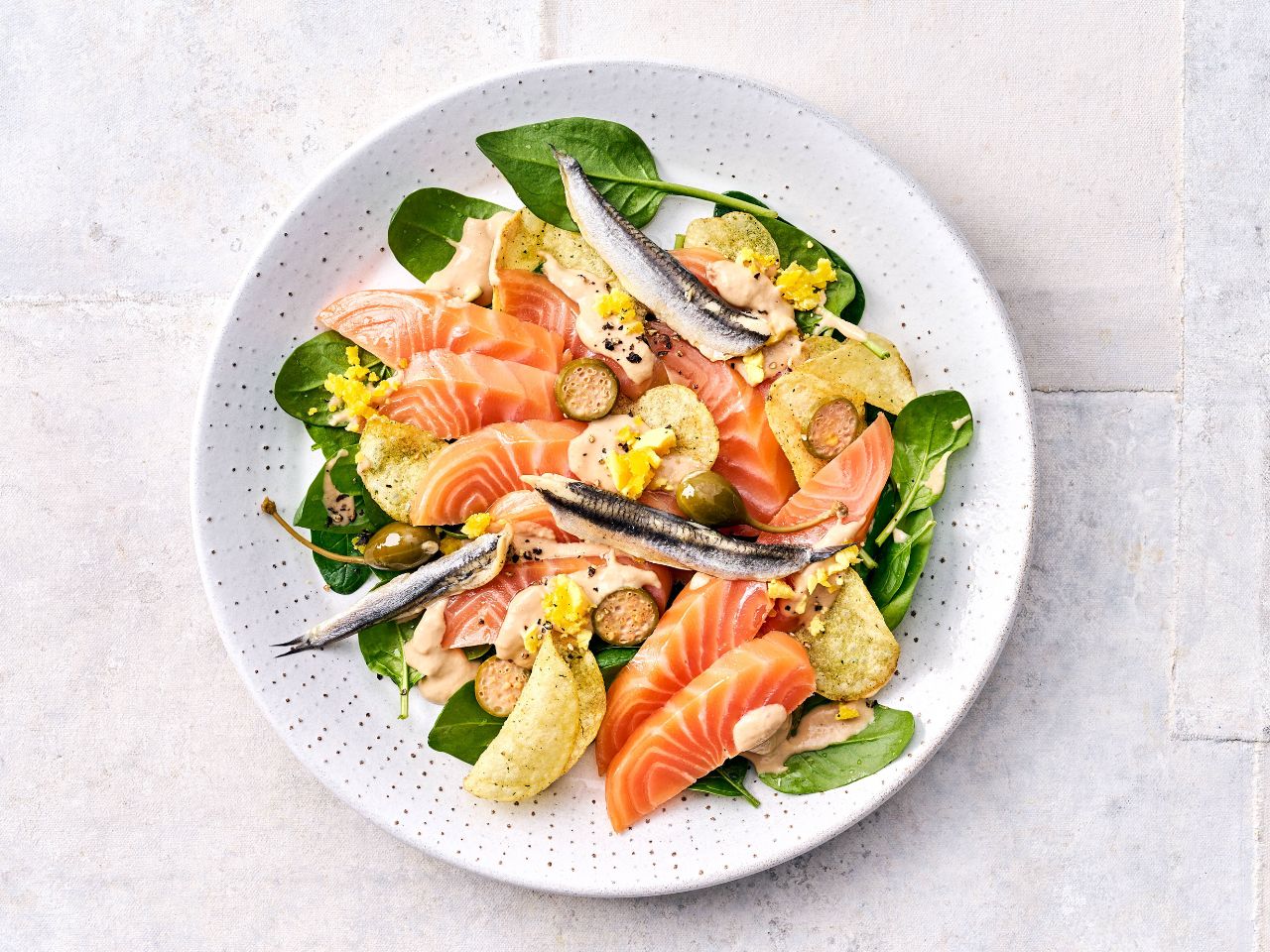 - 3 Spinat waschen, trocken schleudern und mit Chips anrichten. IKARIMI Rückenfilet in breite Scheiben schneiden und darauf verteilen. Mit der Sauce beträufeln und dem zerbröselten Eigelb bestreuen. Sardellen in Zitronenöl und restliche Kapern im Ganzen oder in Scheiben geschnitten draufgeben. Mit grobem Pfeffer würzen.