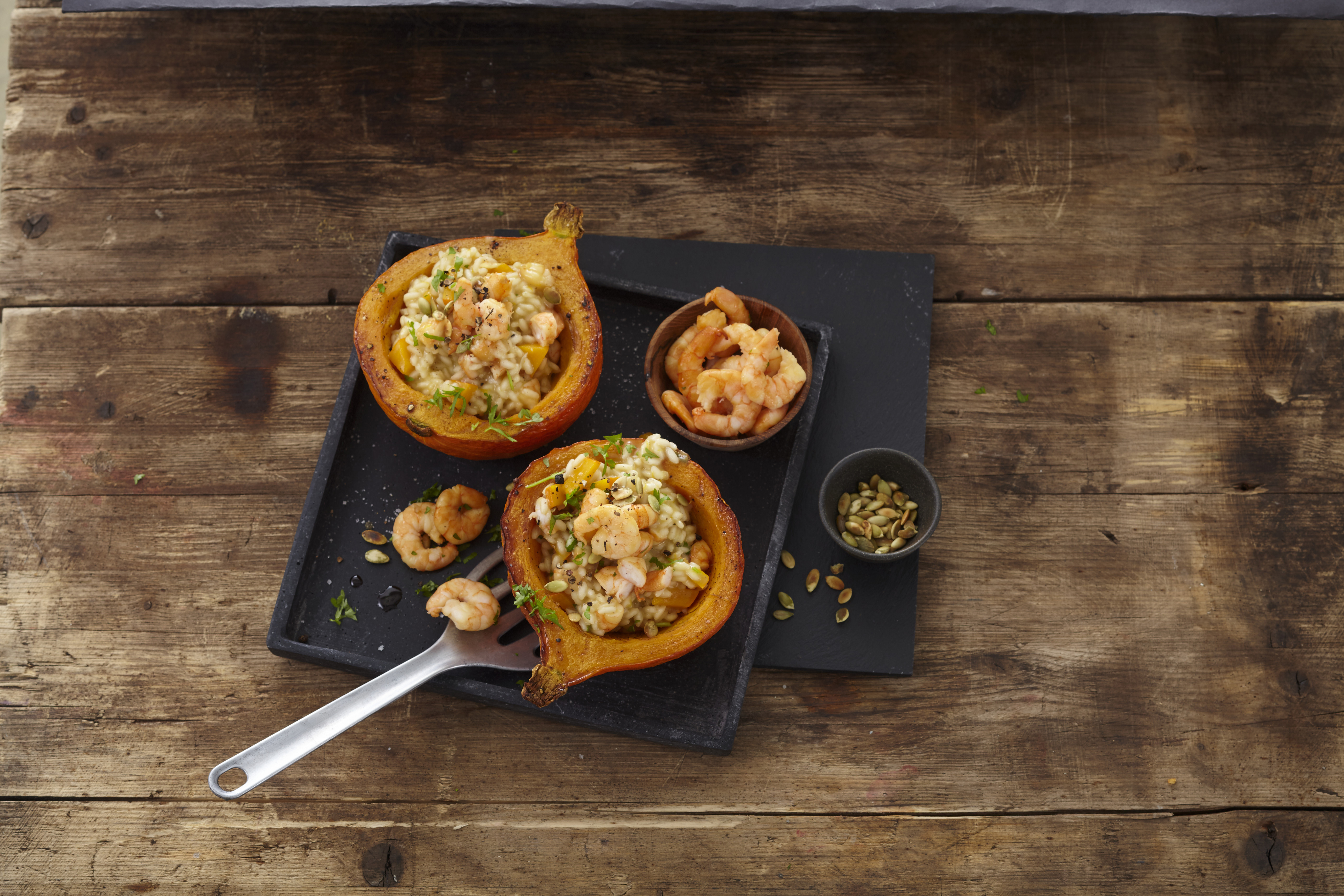 Soulfood für graue Tage: Kürbisrisotto im geschmortem Hokkaido mit heißgeräucherten Garnelen und Kürbiskernöl.